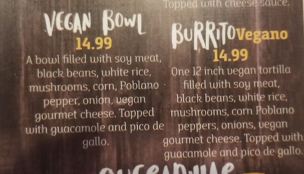 Serves meat, vegan options available. Mexican restaurant with two vegan items on the menu: a burrito and a bowl. Reported closed April 2024.
