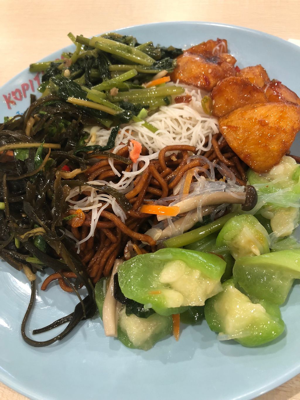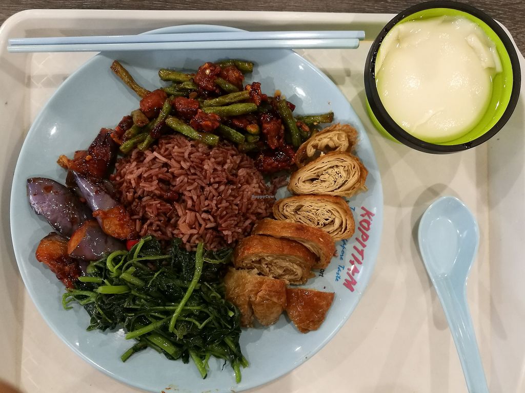 Food from the vegetarian stall and beancurd from the adjacent stall.