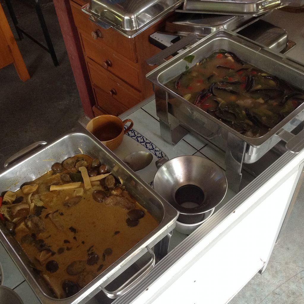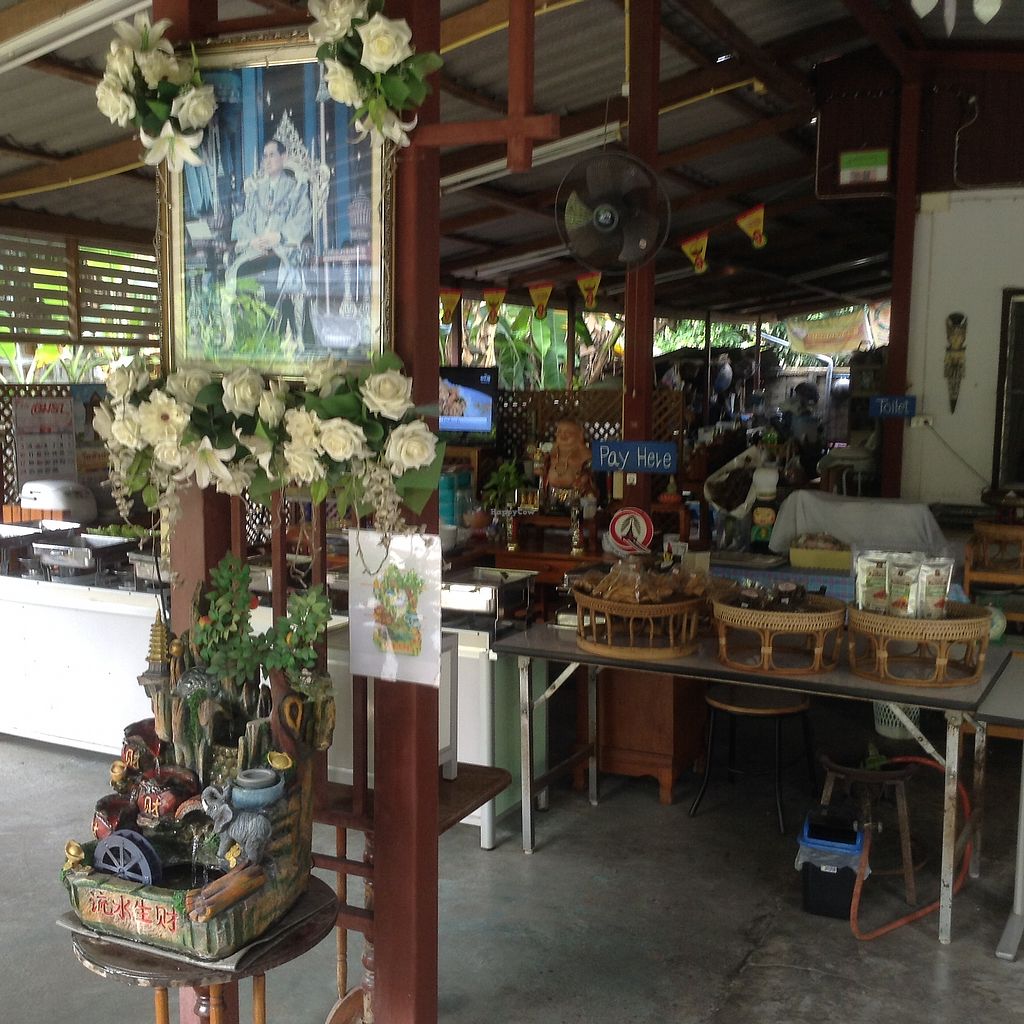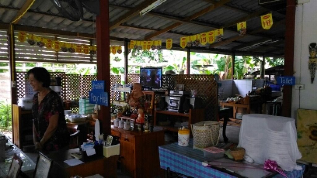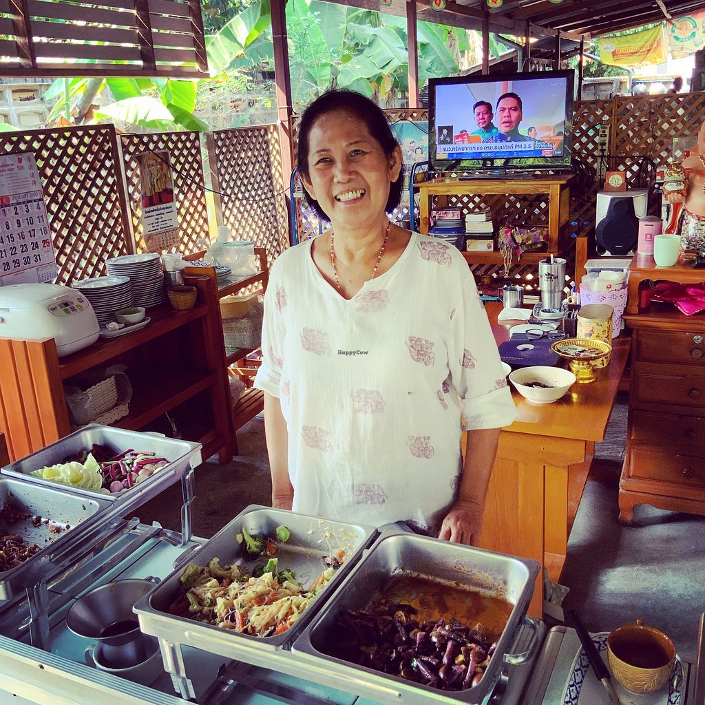 This is one of my absolute favorite veggie places in thailand. The food is super tasty, not the usual curries, but a lot of different things i haven't had before. Dishes are packed with fresh veggies and we never had the same thing twice in the 4 times we ate there. The owner is really nice,letting you taste the stuff before choosing, brings xtra things to try and is very generous with the size of the plate. I will deffo go back next time i'm in the area!! To find it, walk north from the chinese temple, take the first small soi down on your left hand (follow the small yellow and red sign), keep on this street as it takes a swing to the right, walk down a few houses and it is on your left hand, set a nice garden, has the jae banners on the fence.