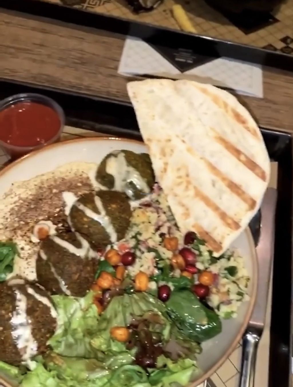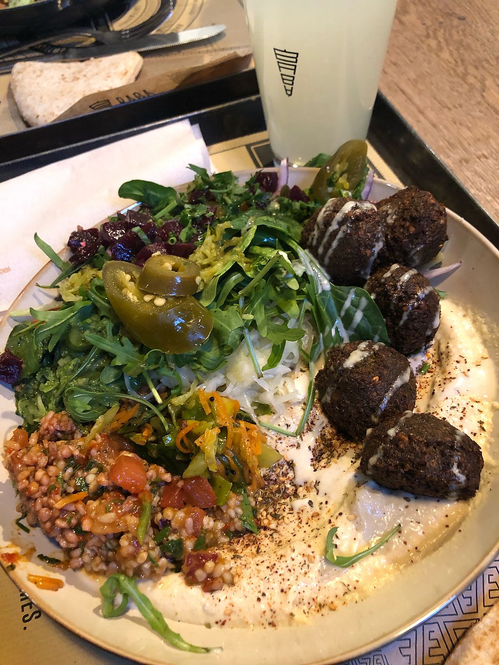 The food here is very good! I tried the whole wheat laffa and the falafel plate. The toppings are fresh and tasty and beyond the usual. You can choose free toppings like spinach, rucola, beetroot and fresh herbs..... Unfortunately they have no vegan sauce, but as a vegan alternative you can have humus instead.