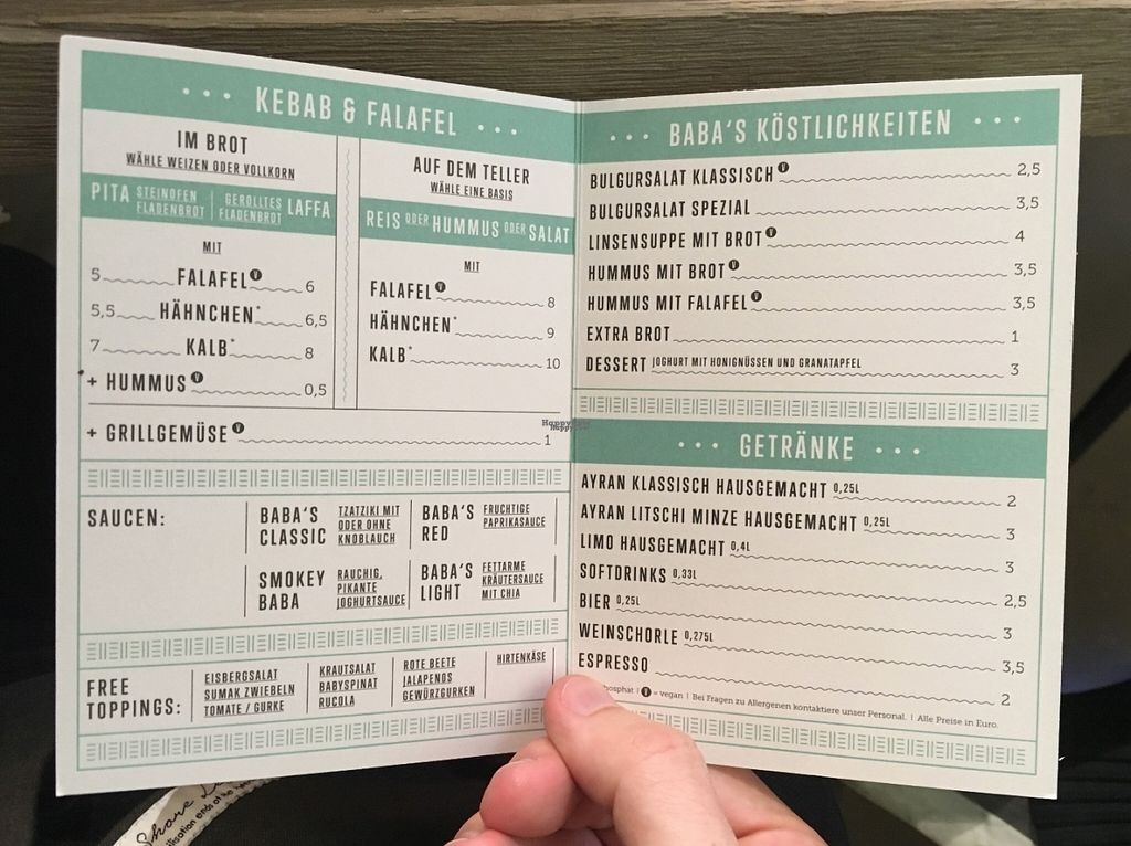 Baba Green is a stylish kebab and falafel restaurant in the city center. It's very big such that it should be possible to find a place to sit even on weekends.