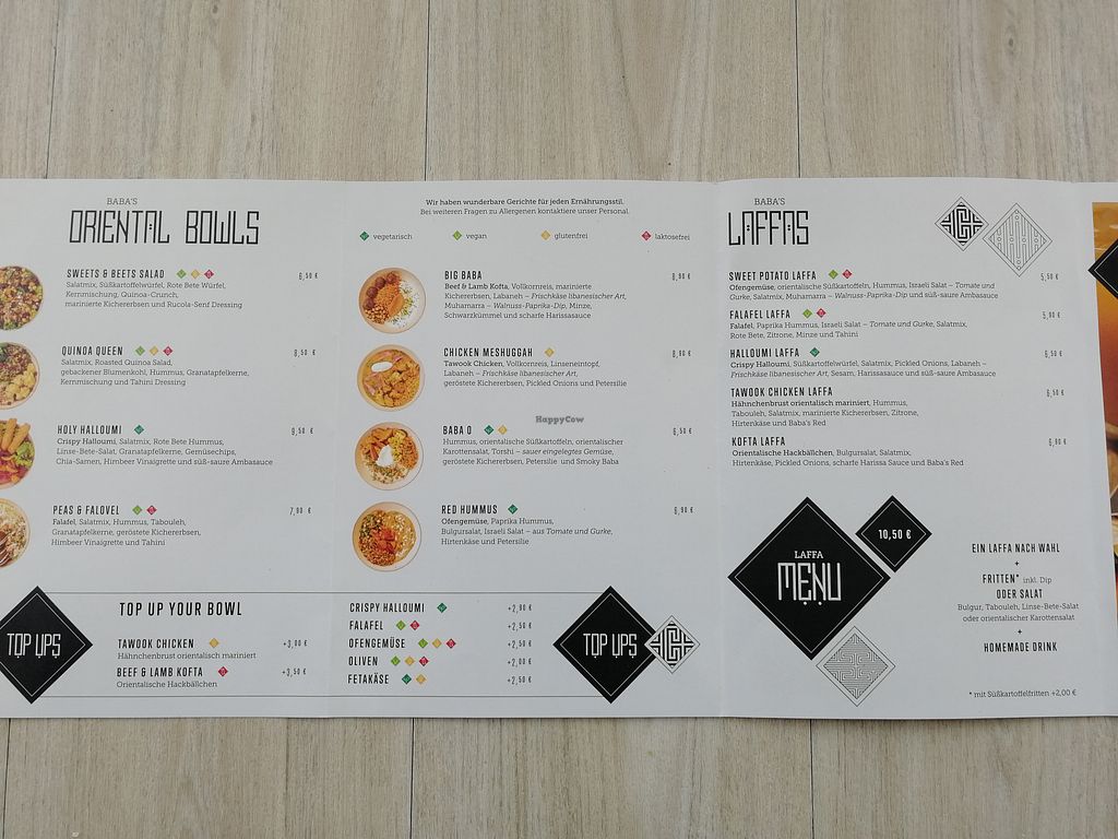 Recently, there is an updated menu card. The dishes are fixed, no individual selection is possible. But the choice is plentiful and there are enough vegan and vegetarian menus. The homemade ice tea and the homemade lemonade are delicious. The falafel and the fresh ingredients taste good.
