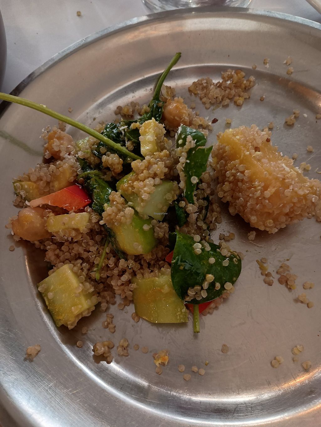 We stopped in for dinner and let our server know we were vegan. We inquired about what was, or could be made vegan and she happily pointed out dishes on the menu. We did notice that there were few vegan options that included some sort of protein and we asked if chickpeas could be added to one of the vegetable-only entrees. With an affirmative response, we ordered the Vegetable Samosa, Roti, Dal Tadka and Aloo Baingan w/added chickpeas. The food was very tasty and the portions were considerable. I would say we probably could've gotten away with just one entree and the samosas and roti.