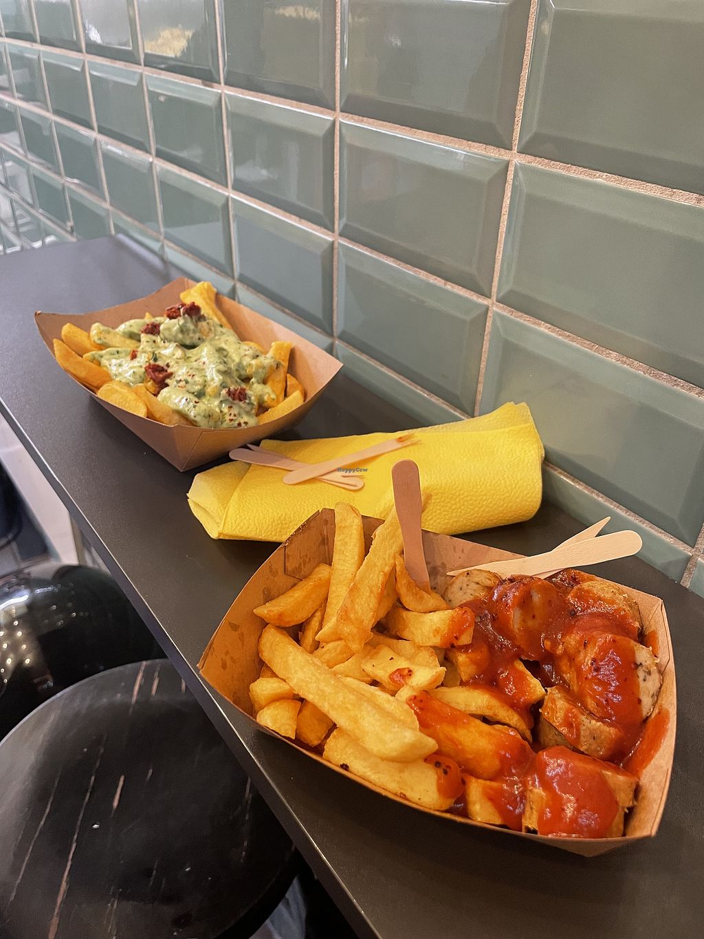 This place has the best vegan Currywurst I ever had. Fries are also really good and they have some more vegan dishes, Like Fries loaded with a green sauce (photo)