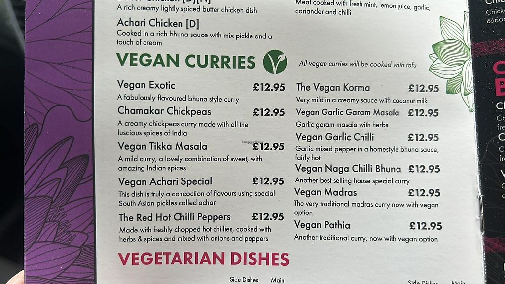Serves meat, vegan options available. Restaurant with a clearly marked “vegan curries” section, offering fully vegan dishes cooked with tofu like vegan korma (mild coconut-based curry), vegan tikka masala (tomato-spice gravy), vegan garlic garam masala (garam masala with garlic), vegan garlic chilli (spicy chilli-garlic sauce), and more. Open Mon-Thu 12:30-15:00, 17:00-23:00, Fri-Sun 12:30-23:00. no extra note