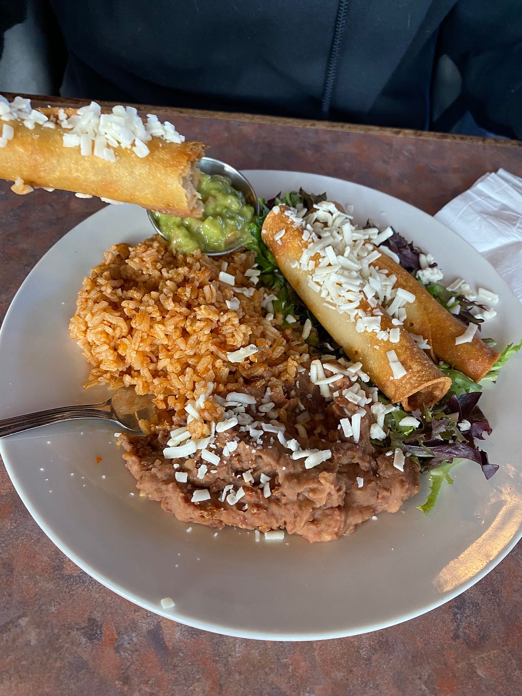 Del Rio burrito, Fishless Tacos with rice and beans, strawberry and li…