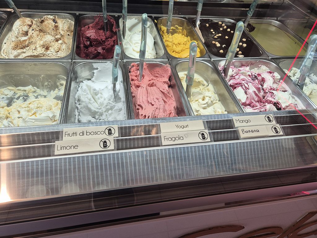 Gelato shop offering six labeled milk-free gelato flavors that are also vegan. Flavors include dark chocolate, lemon, mixed berry, strawberry, banana, and mango. Open Mon-Sun 10:00-23:00. More