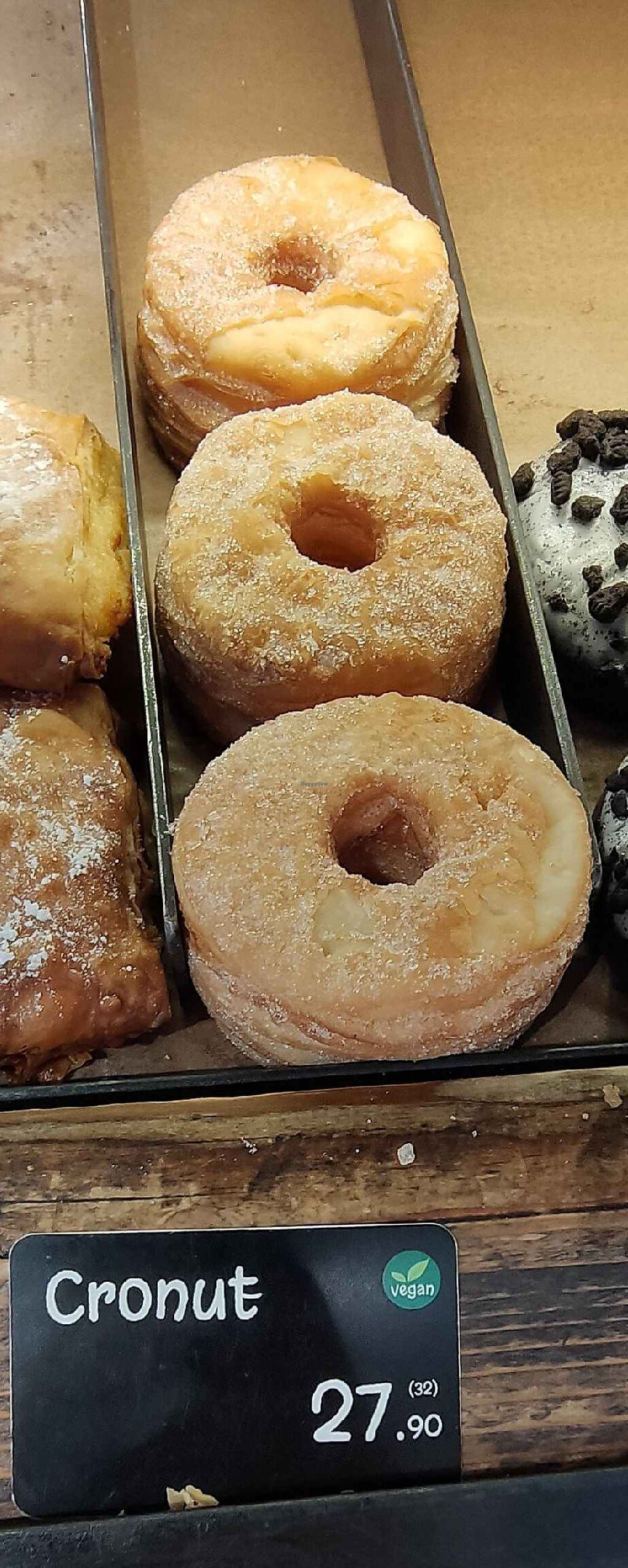 Bakery selling bread and labeled vegan pastries, including cronuts, pastries, filled sandwiches, and pretzels. Open Mon-Fri 7:00am-8:00pm, Sat-Sun 8:00am-7:00pm.