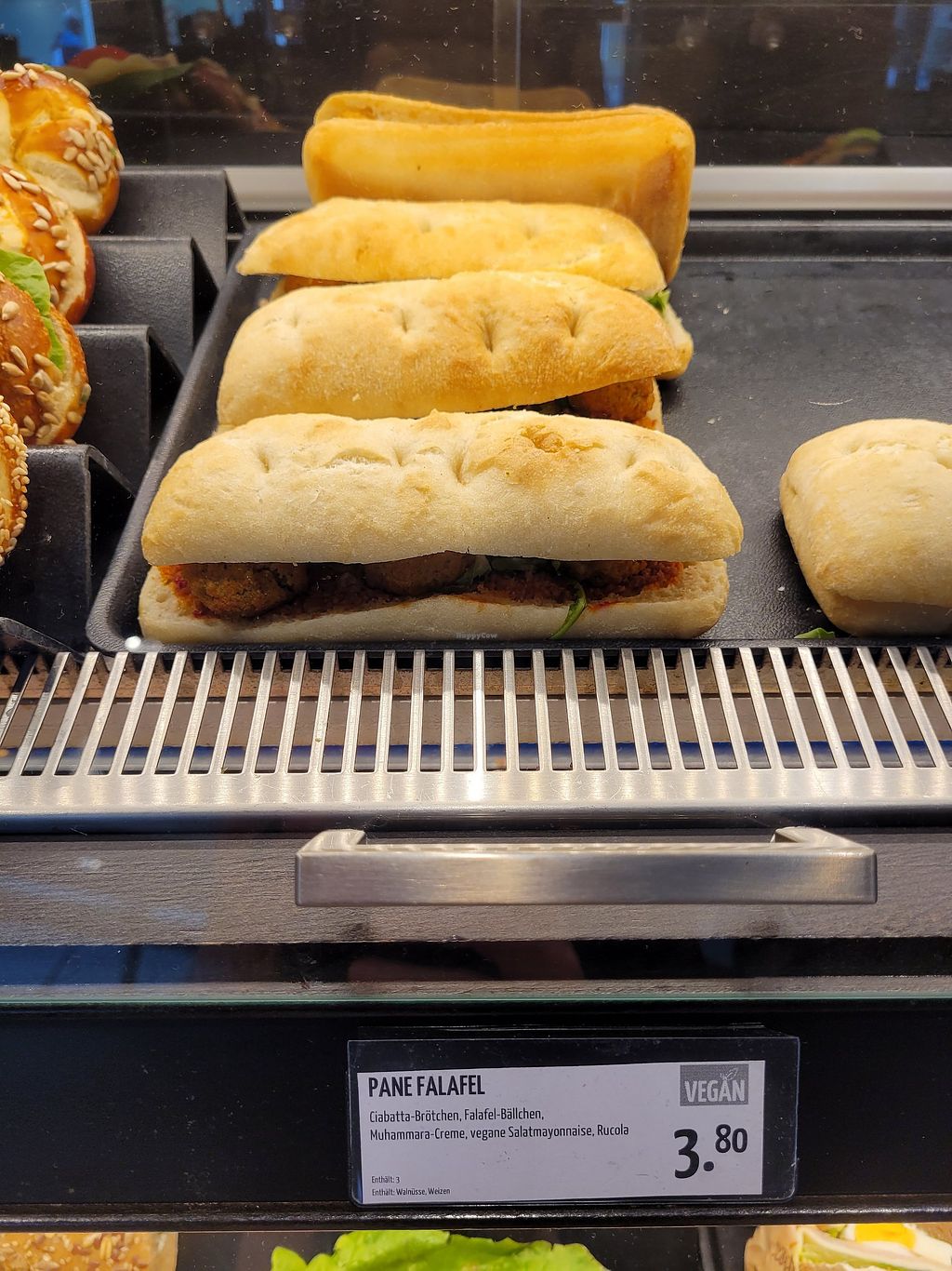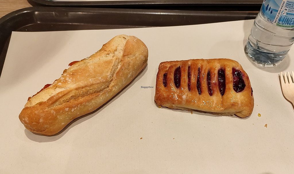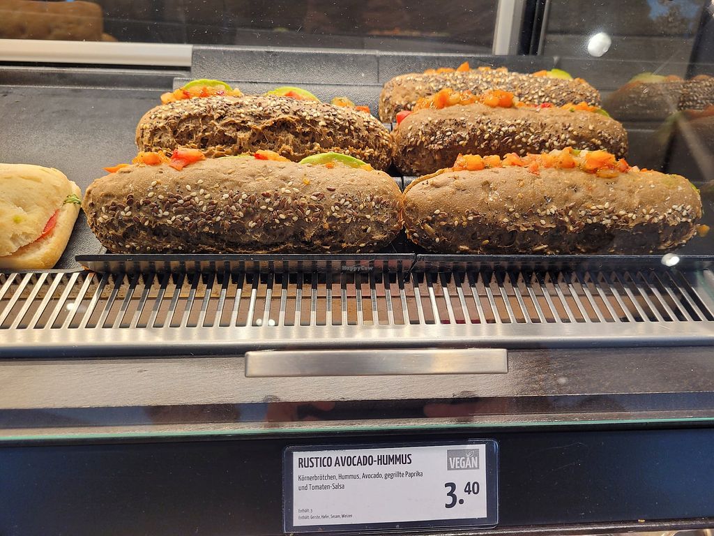 Ein belegtes Brötchen mit Tomaten und Avocado und eine Kirschtasche