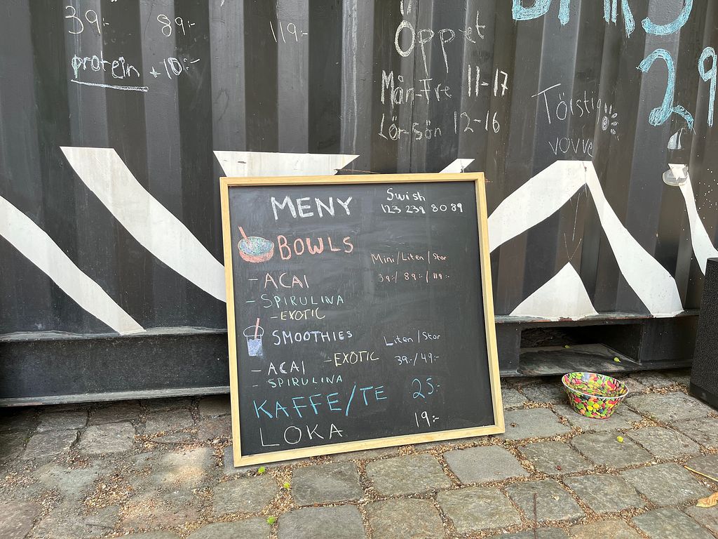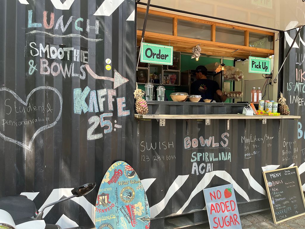 Offers smoothies, smoothie bowls, coffee and healthy snacks located in a container at Kungstorget, between Saluhallen and the canal. All products are vegan, eco-friendly and completely free of added sugar. Signature dish is smoothie bowls based on either acai or spirulina. Toppings include fresh banana, fresh strawberries, fresh kiwi, cocoa nibs, goji berries, granola (may contain traces of nuts), chia seeds, and peanut butter. Reported closed August 2023.