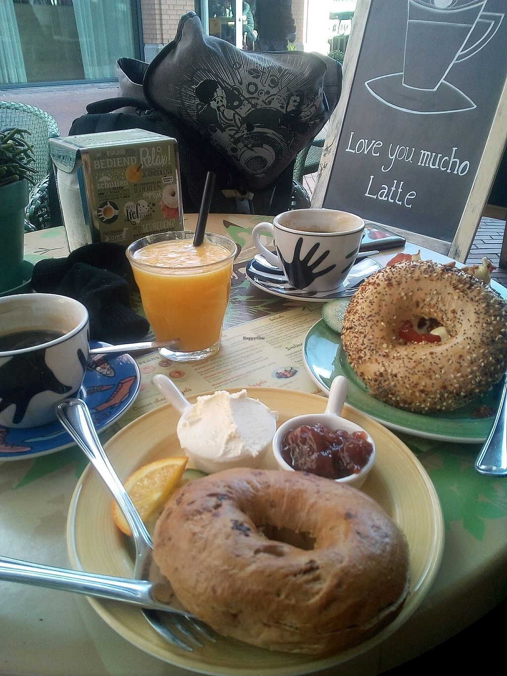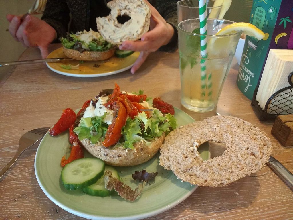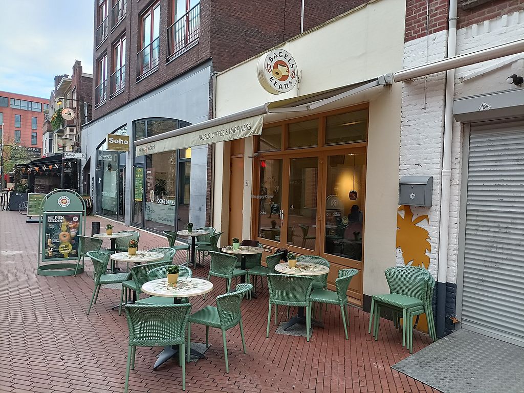 Bagels & Beans offers a variety of vegan bagels. All of the bagels themselves are vegan, and from the fillings at least the hummus & sundried tomato bagel as well as the Dutch weed burger are completely vegan without changing anything. Cream cheese can be substituted for hummus. The bagels were fresh and delicious, and so were the fillings. My boyfriend had the hummus & sundried tomato one and I had the Dutch weed burger bagel, which has a patty made out of seaweed and sour sauce plus veggies. We both loved them! The atmosphere can be a bit noisy but the food was great,