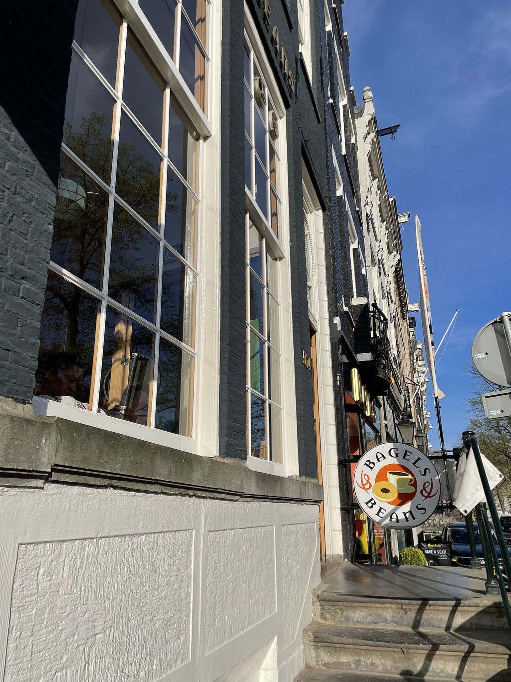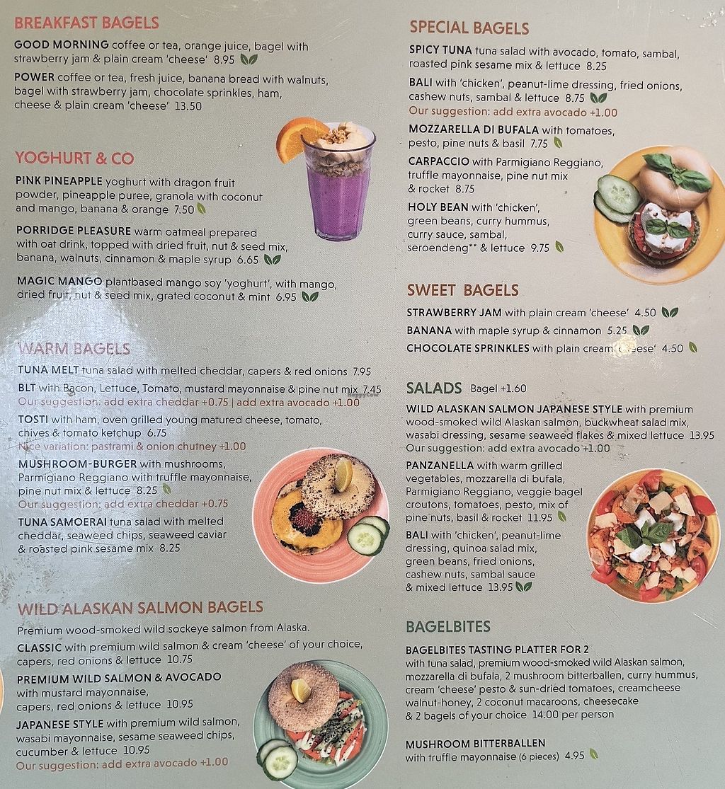 Serves meat, vegan options available. Dutch chain of lunchrooms offering a menu inspired by the tastes of Europe and Southern France. Has plant milk for drinks, and bagels have filling options like vegan cream cheese, avocado, and hummus. Food may vary by location: some may offer tempeh, the Dutch Weed Burger, or something else - ask. Offers gluten free options although availability of gluten free bagels may vary. Open Mon-Fri 08:30-18:00, Sat-Sun 09:00-18:00.