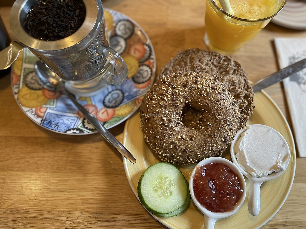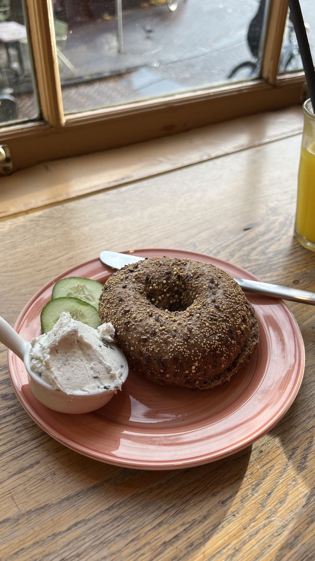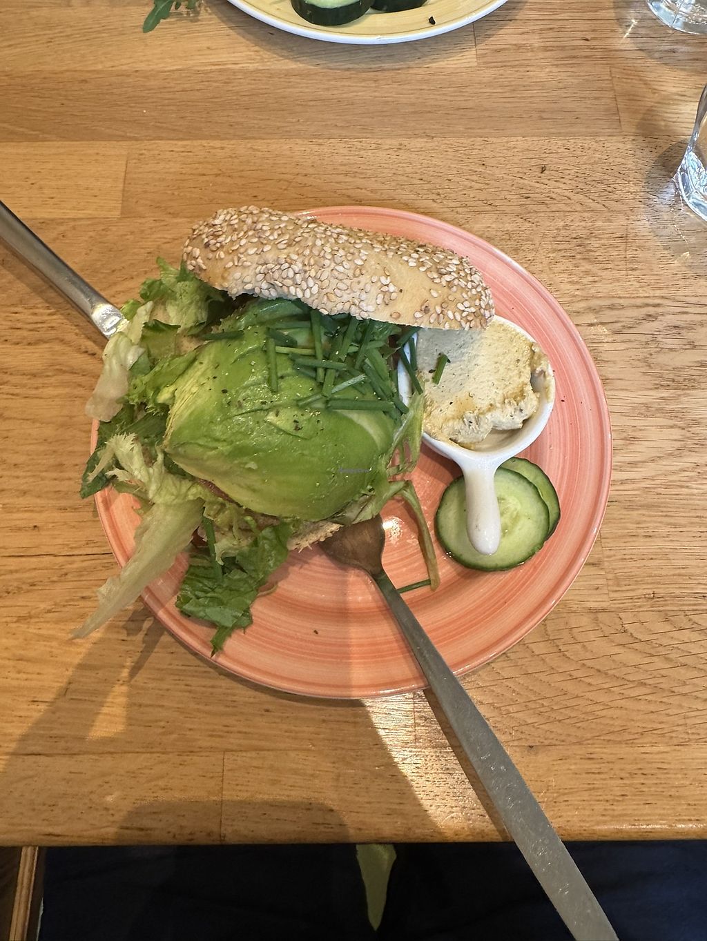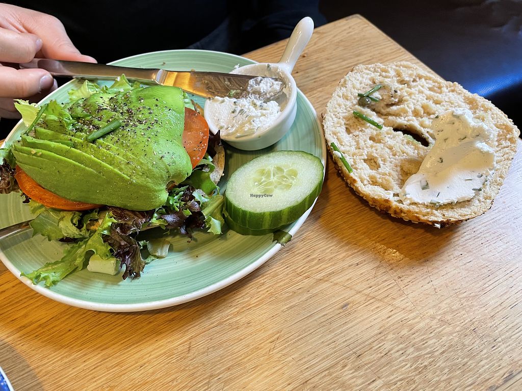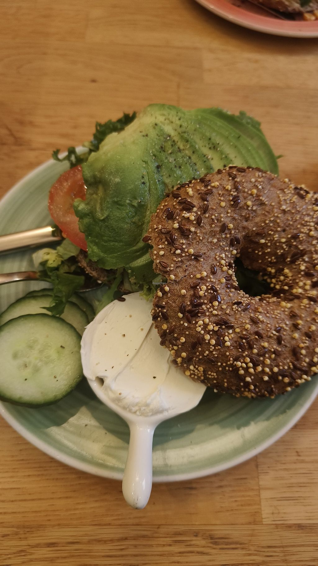 They offer a few vegan option which is great. The Avocado Bagel with chives cream cheese was good but the bread was a bit dry. The Cappuccino with oatmilk tastes good.