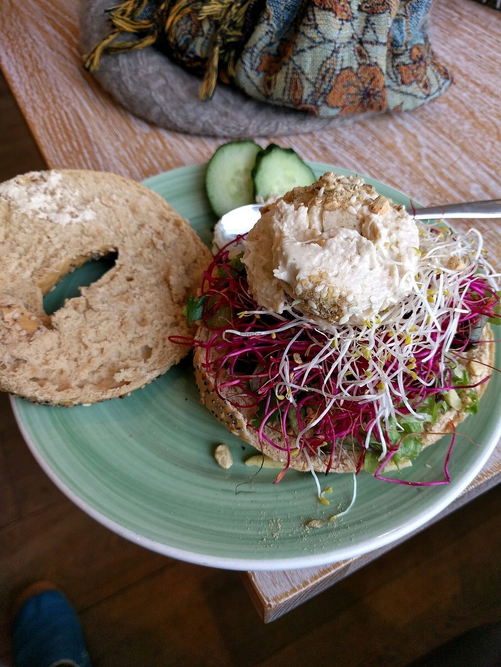 Wholewheat Spelt bagel + hummus + sun-dried tomatoes + rucola + cucumb…