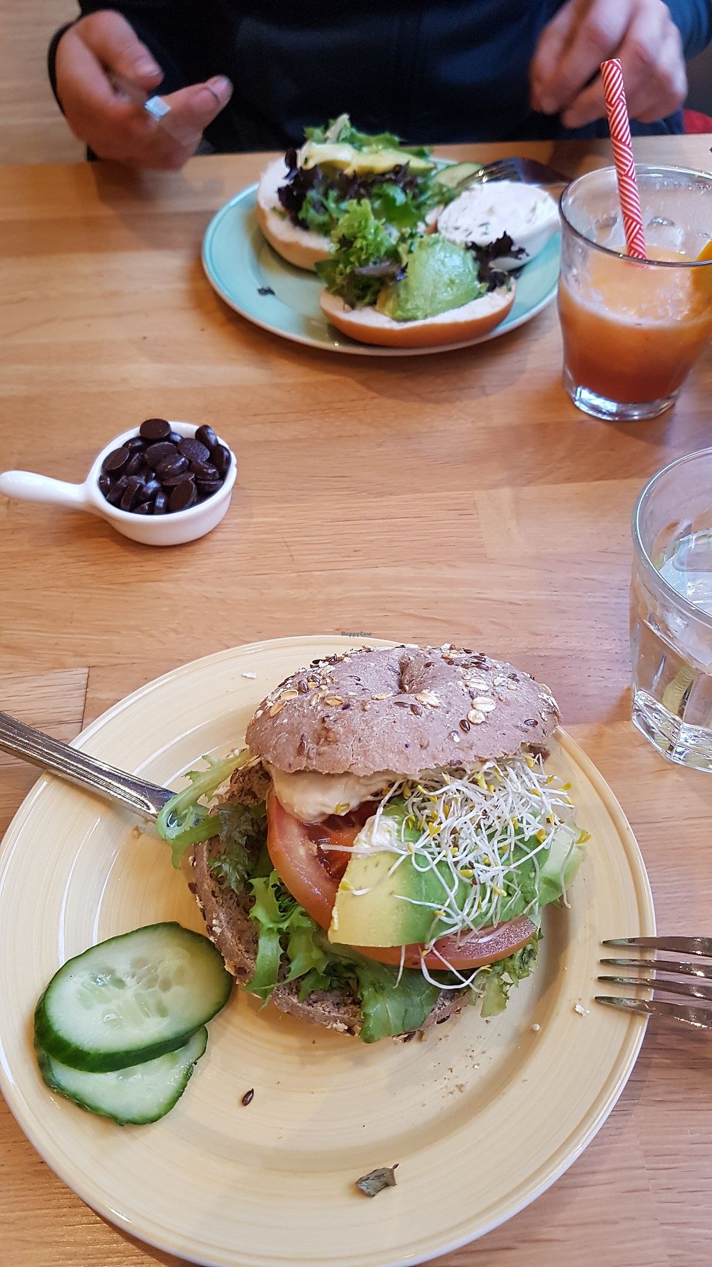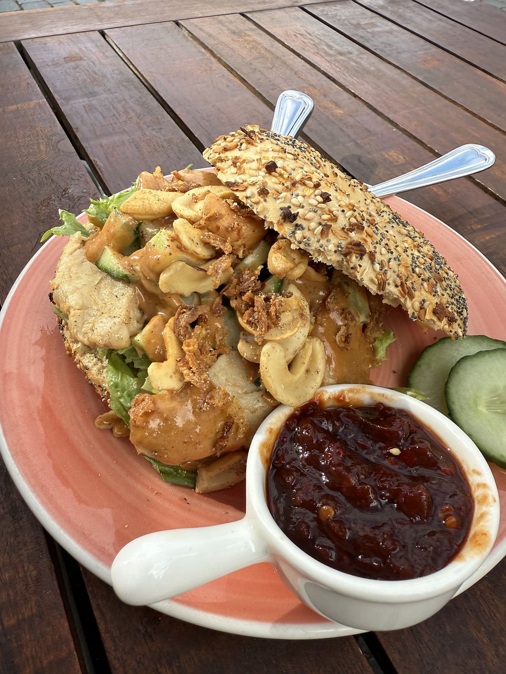 I had the avocado bagel with tomato, cucumber and vegan cream cheese plus a strawberry smoothie. My husband had a mango smoothie and Bali bagel with peanuts, peanut sauce and ‘chicken’.