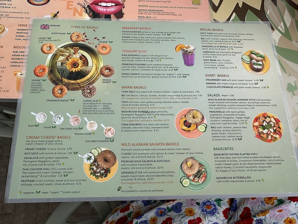 Gluten free and vegan bagel options. Food was delicious and very reasonably priced. Great location, cute decor and the staff spoke very good English and were very helpful with explaining allergens. There's an English menu as well.