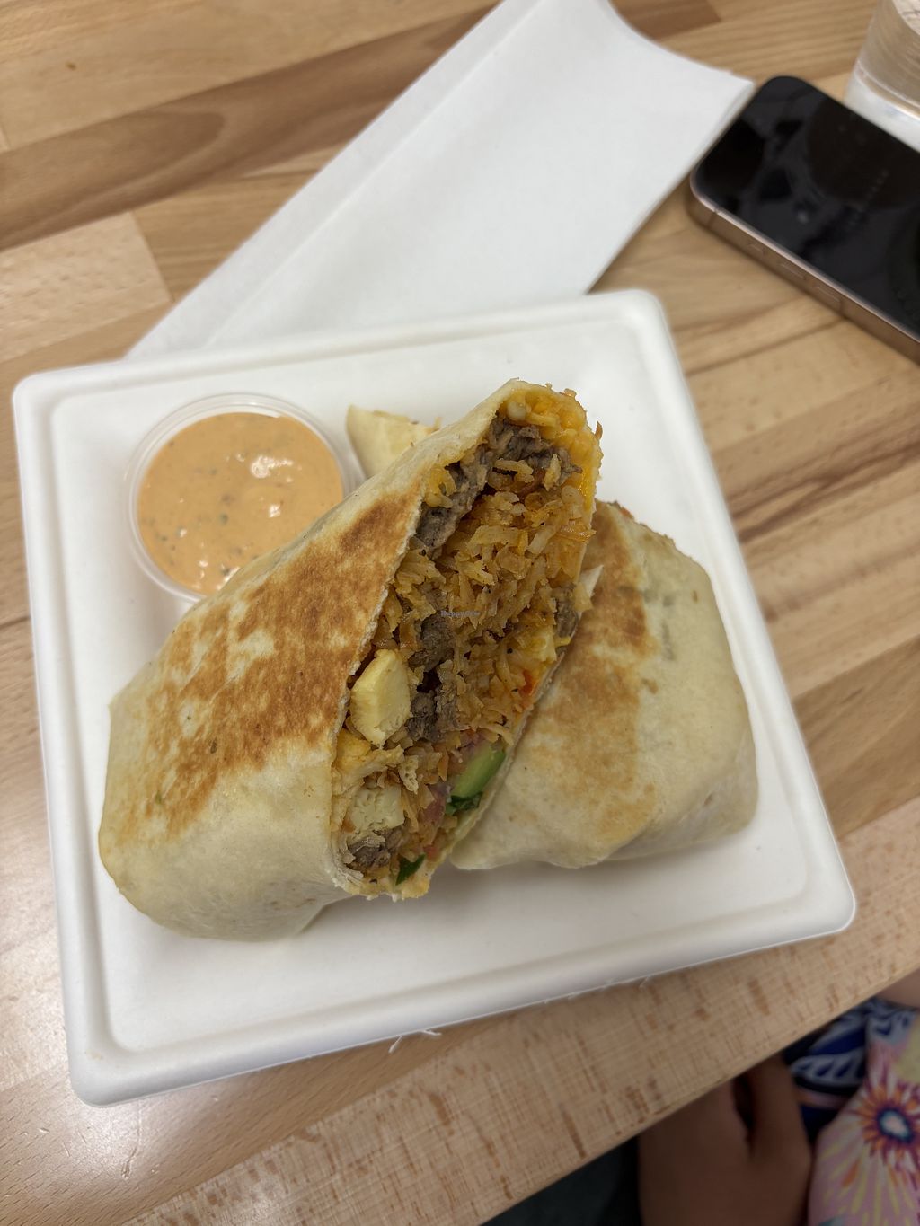 My husband and I ordered the breakfast burrito and tailored it to our individual liking. I ordered it with everything but not the spicy tofu, he didn't want tofu or vegan eggs but everything else was cool. So good!(They don't have vegan cream cheese so we couldn't have a bagel and cream cheese). And the drinks were hot chai latte with oat milk and matcha mango cold drink. Plus I treated myself to a huge peanut butter cookie with cream filling all vegan. So so good and we had to take home half of our burritos because they are so big. My only sad thing is that we don't live close at all. We're in queen Creek. But you can bet that when we're anywhere near, we will make it a point to come again! Yes I DEFINITELY recommend this place