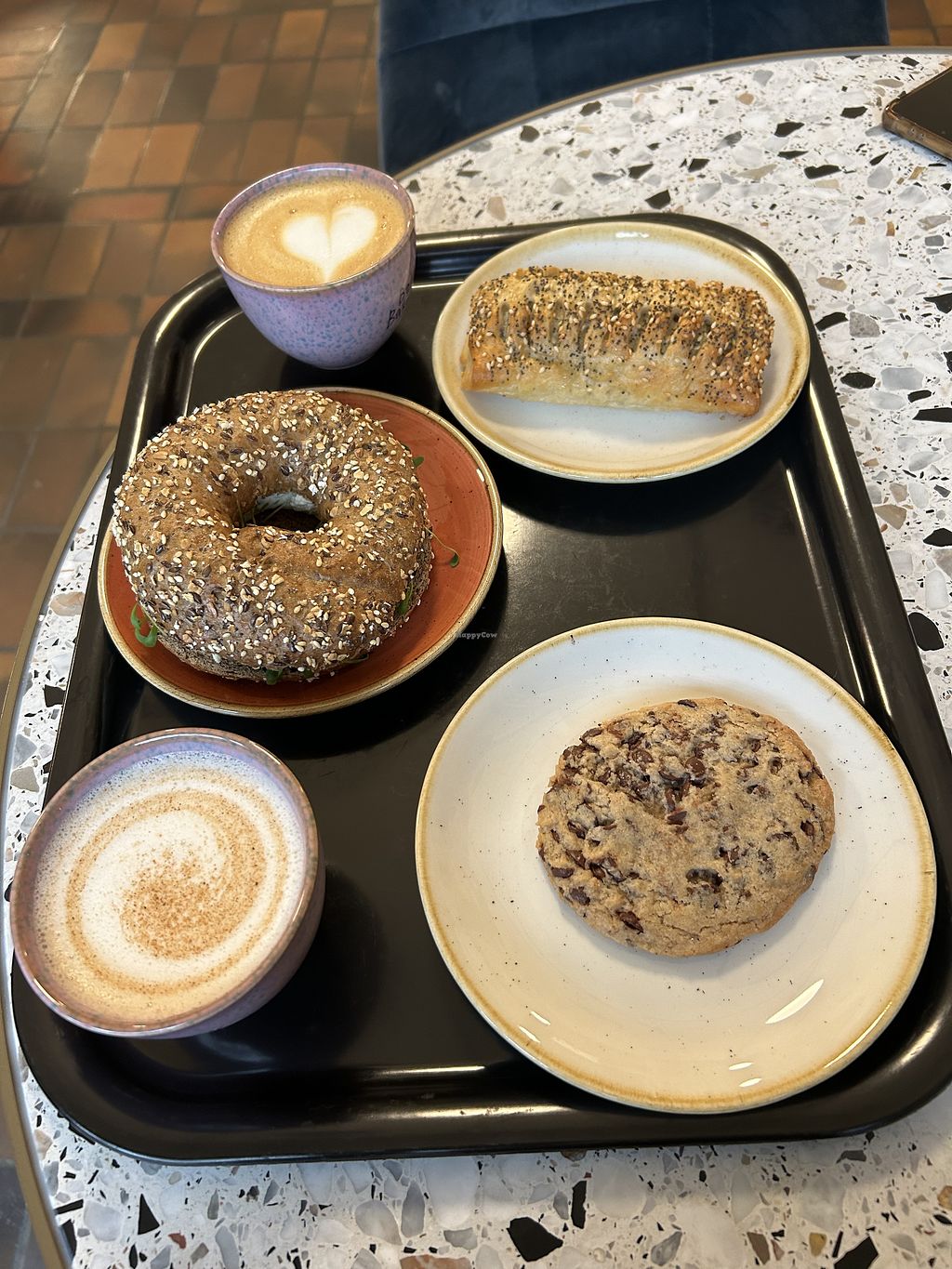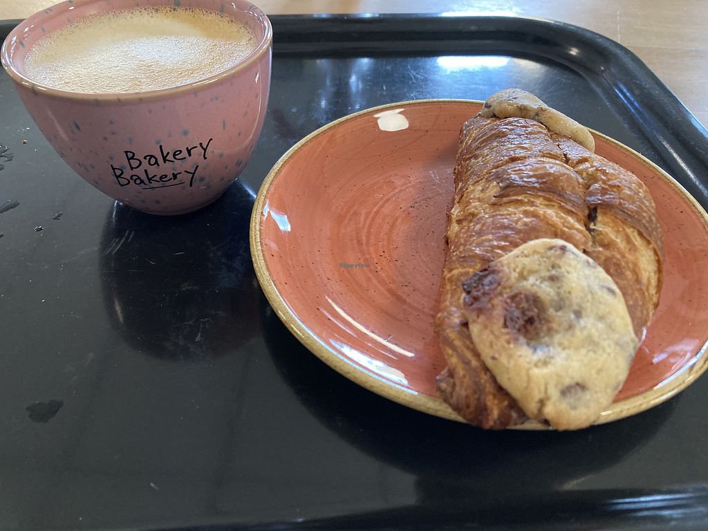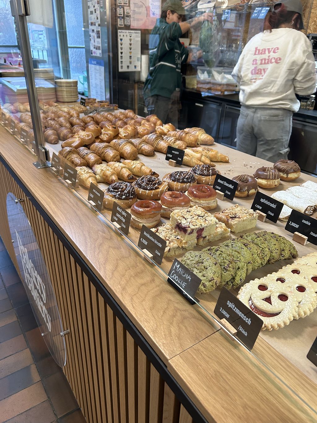 top to bottom: leek and bacon pastry, cream cheese bagel, and chocolat…