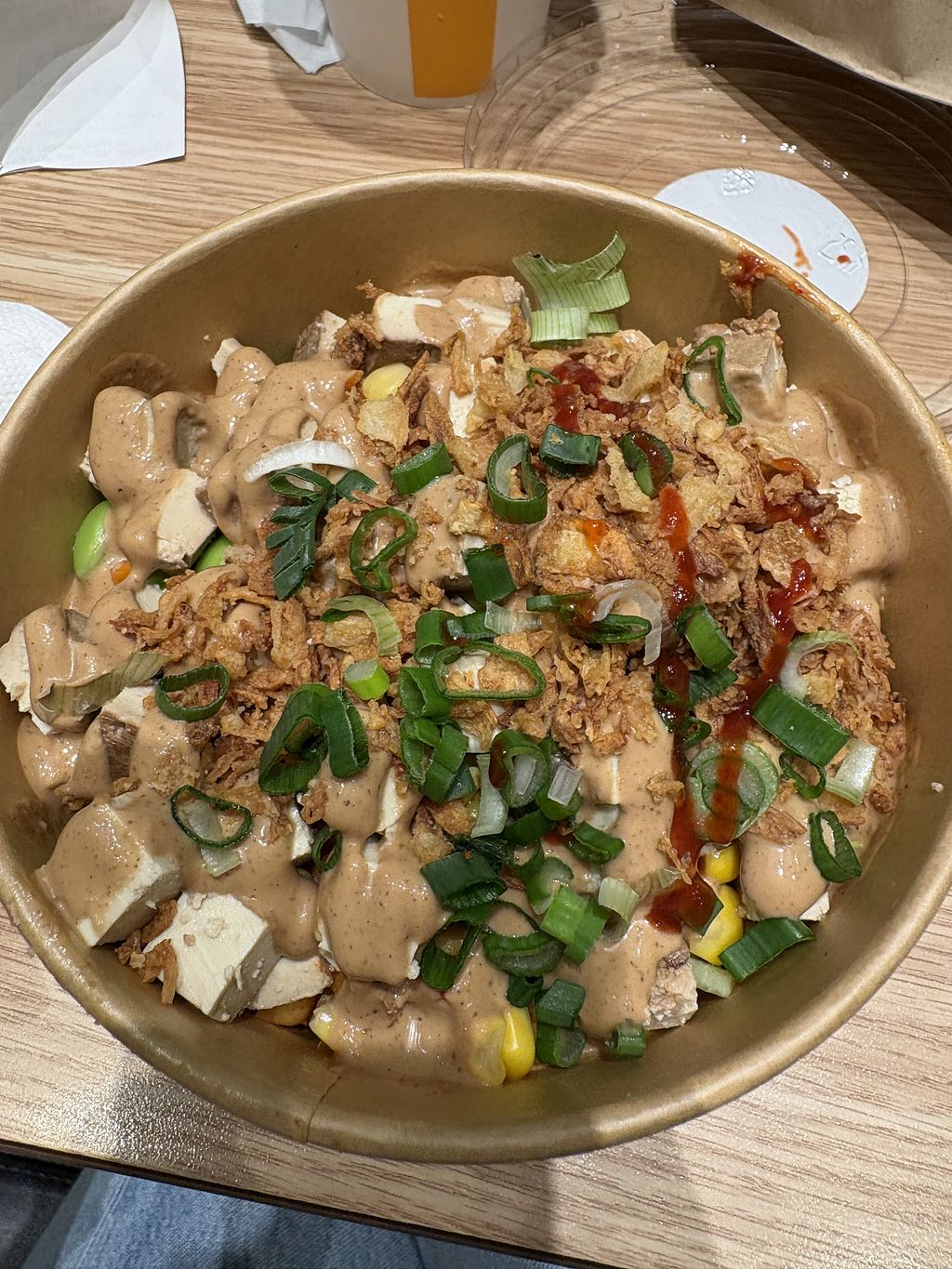 You can pick between lots of veggies, and two sauces. The portion is quite big so I think good value for money. I didn’t love the peanut sauce but not bad. Tofu could be a little more flavorful. If you like poke bowls it’s great, and it’s in the station so convenient if you’re traveling.
