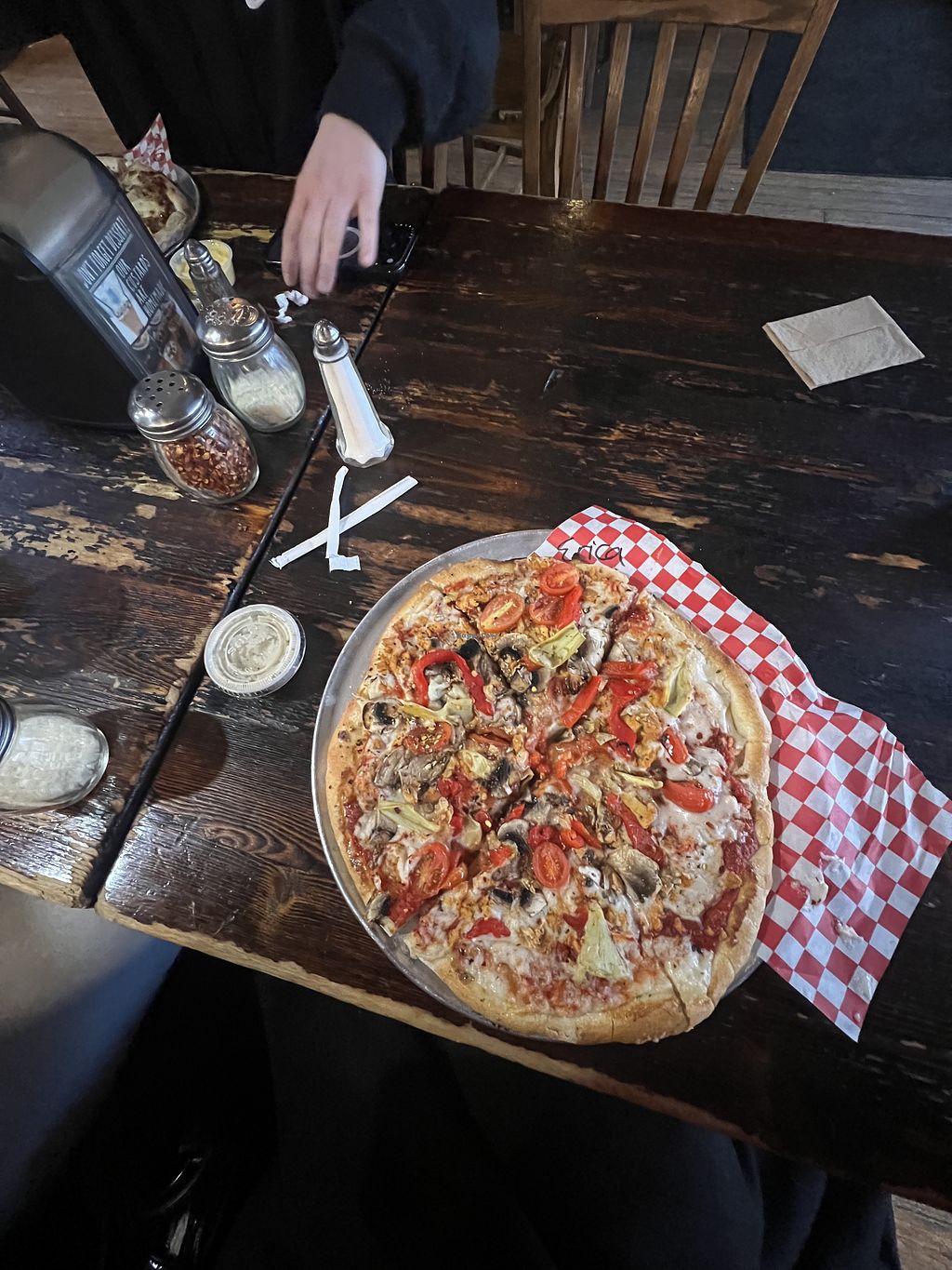 Personal pizza with vegan cheese, vegan sausage and some veggies