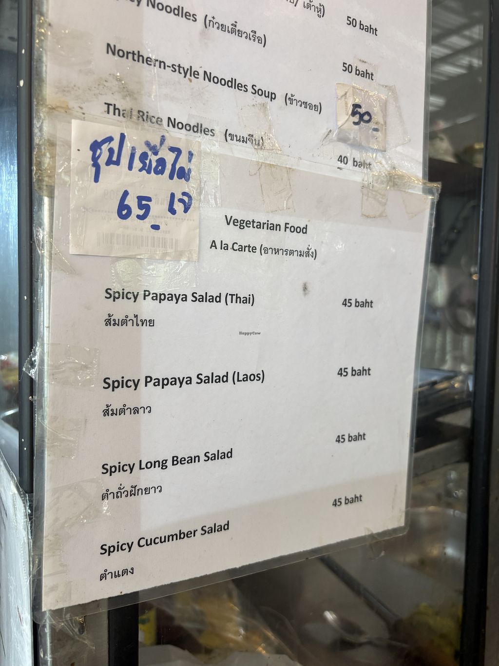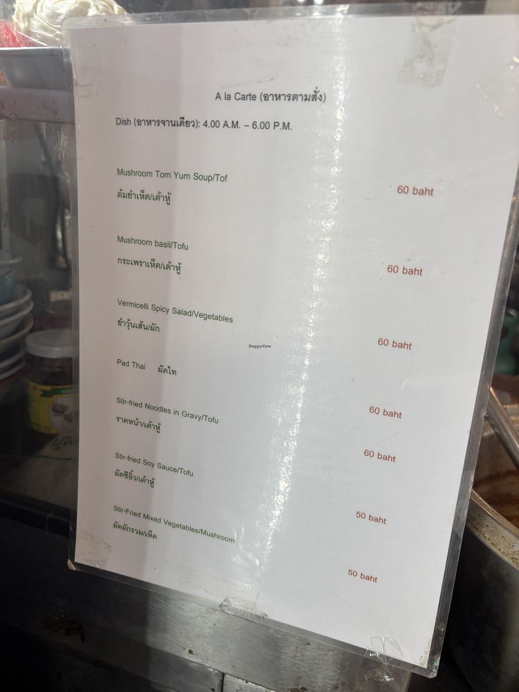Its advertised as vegetarian but it was pretty much all vegan. A lil old lady ran the place. Food was so tasty I got a fair bit for 65 baht. Il defo be back.