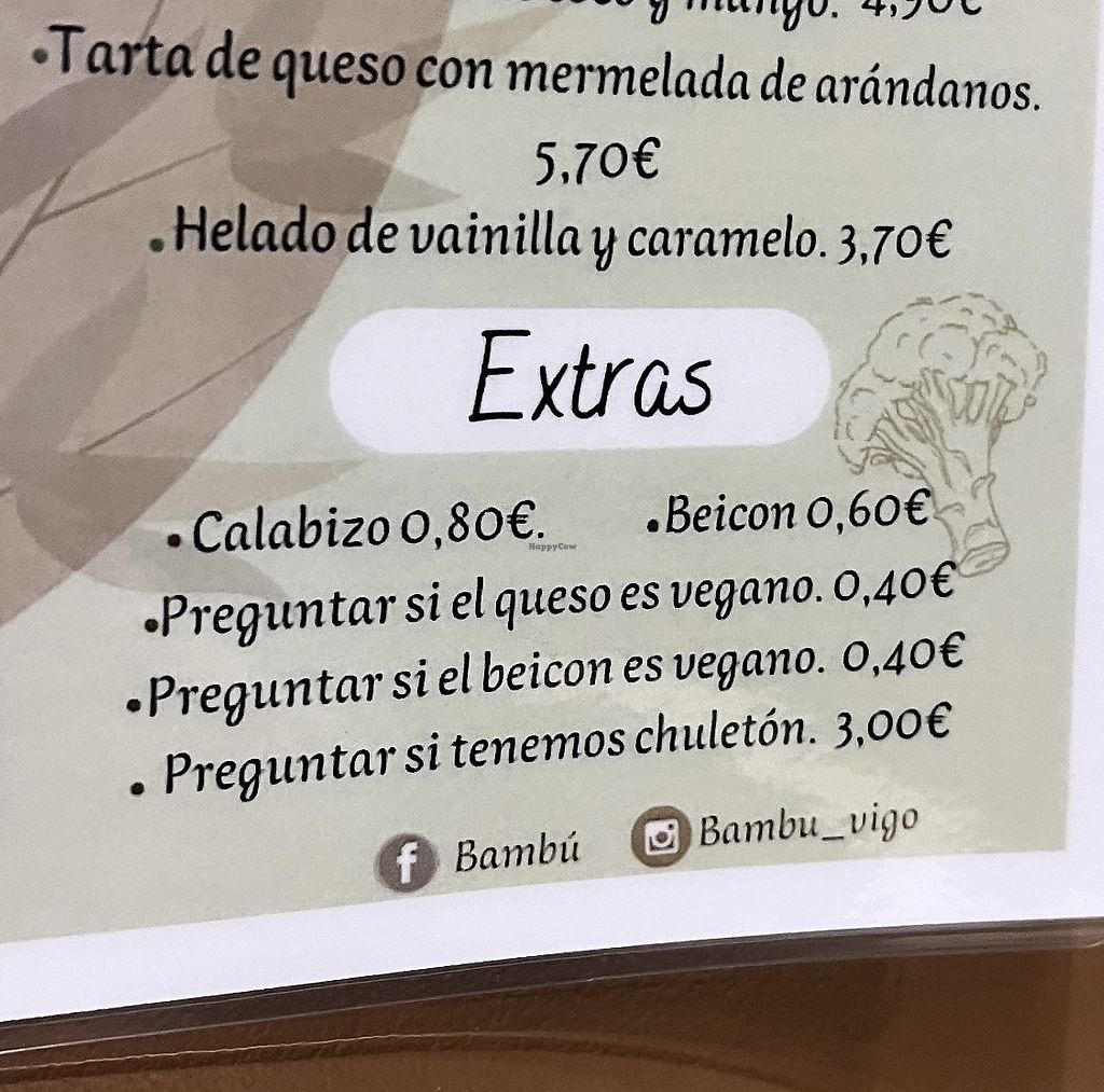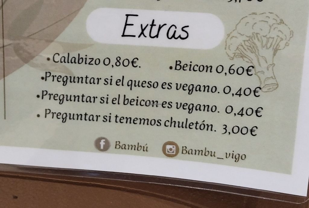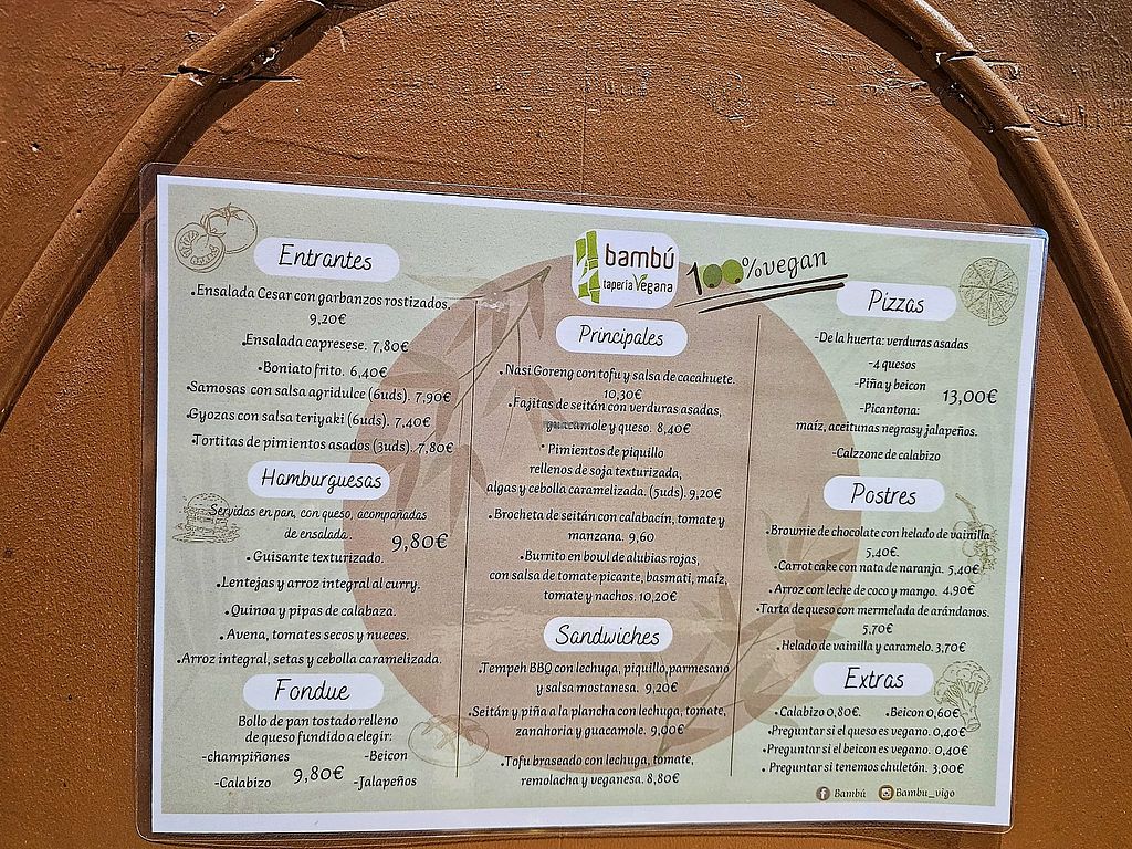 Bambu Vigo is such a delightful surprise! The place feels instantly cosy, and the owners are very friendly. One of the highlights is definitely their menu. They actually list extra costs for asking whether the bacon or cheese is vegan! 😆