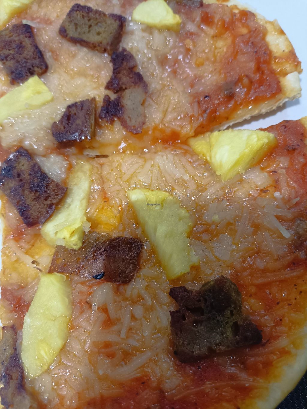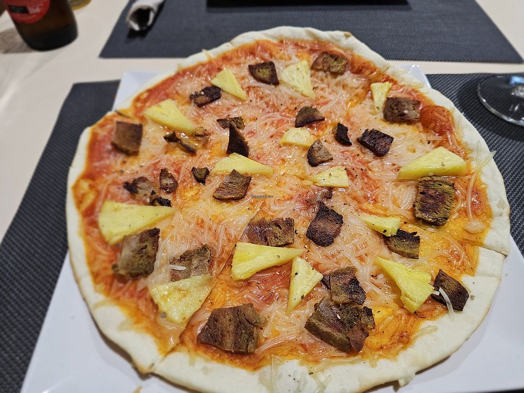 Pedimos pizza de piña e bacon. Sabor moi rico. O bacon moi logrado tanto en sabor como en textura. Masa fina crocante. Unha moi boa opción se coma nós non tes moita fame e queres algo para compartir.