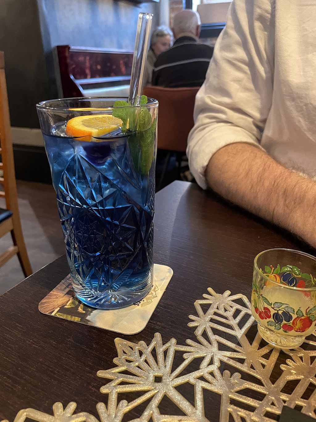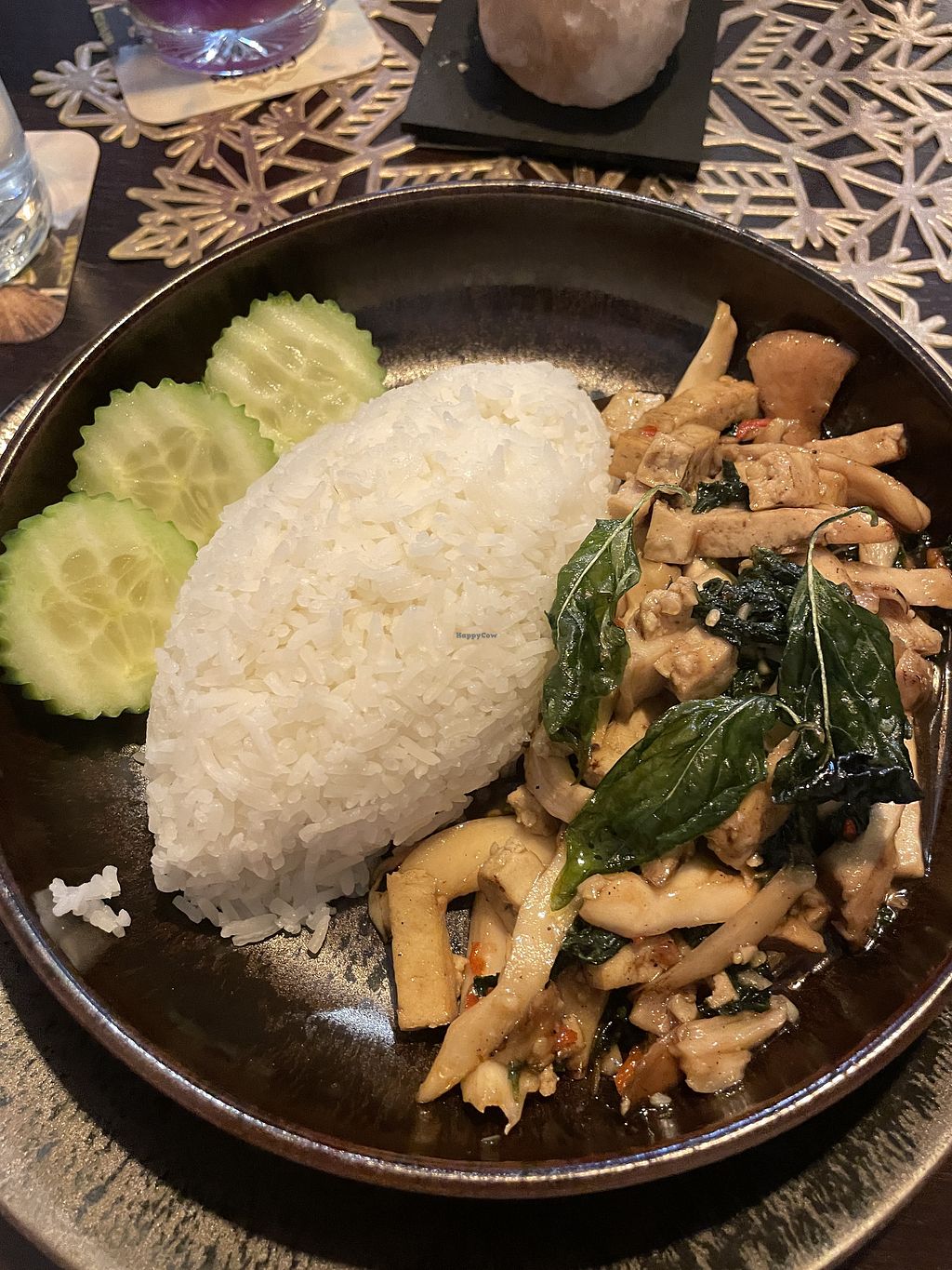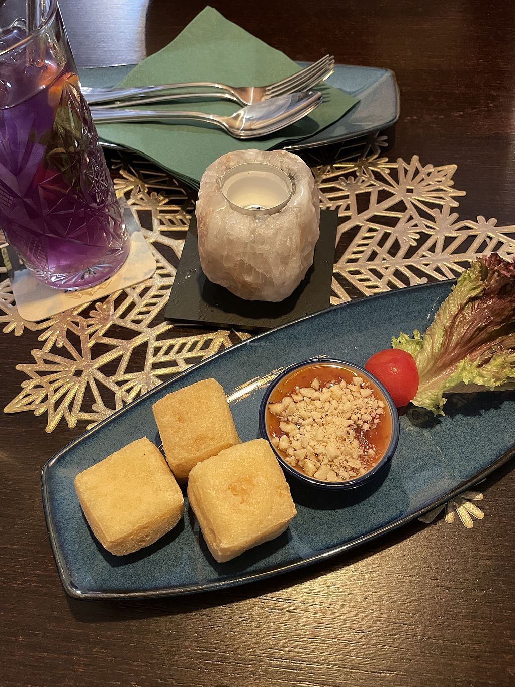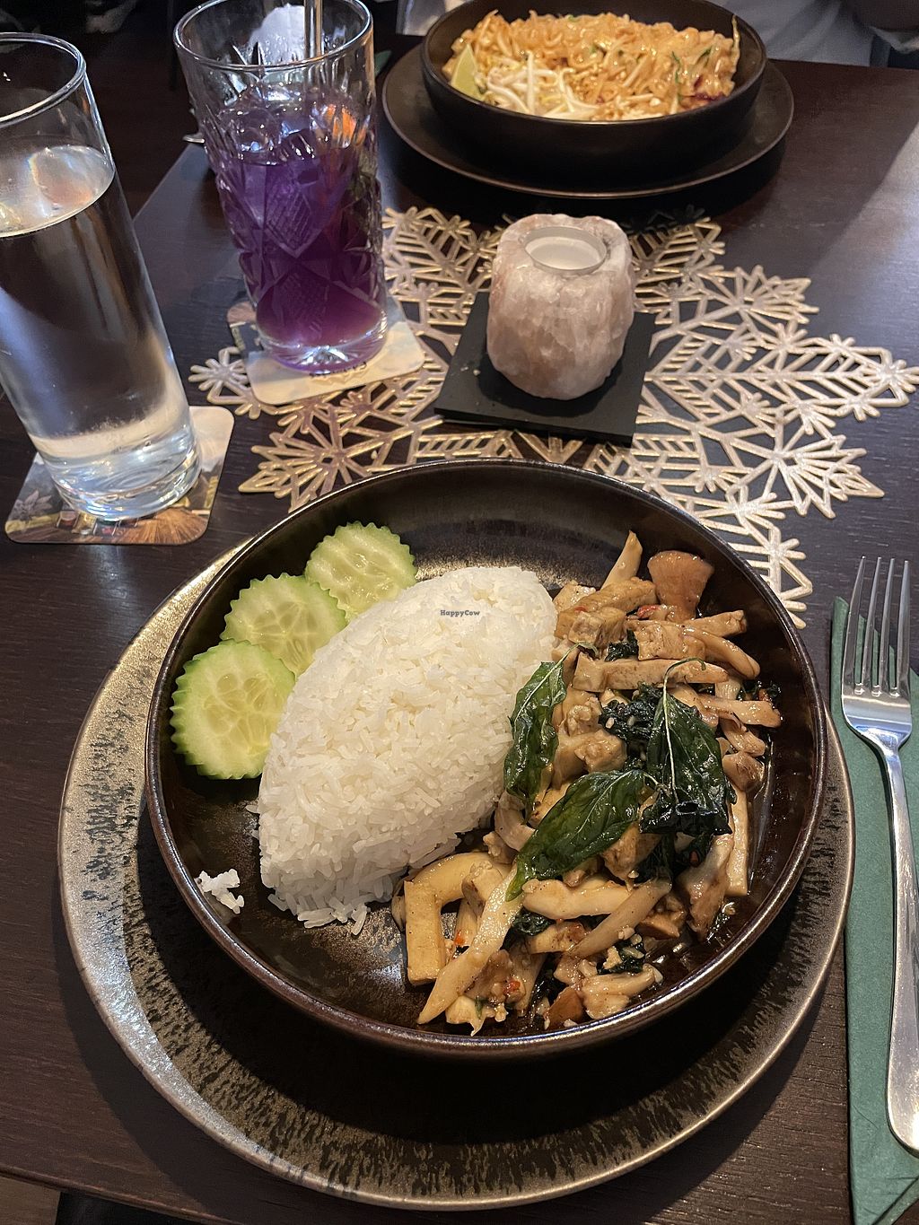The restaurant just opened some weeks ago so we wanted to try it. The food was okay, but we waited a long time - first to order and then for our drinks and food. The starter was served before we got our drinks and one person got her main 10 minutes after everyone else. I asked if the curry with the V-label is vegan and he told me "no it contains fish sauce" - so be careful and ask if you're not sure what is inside the dish.