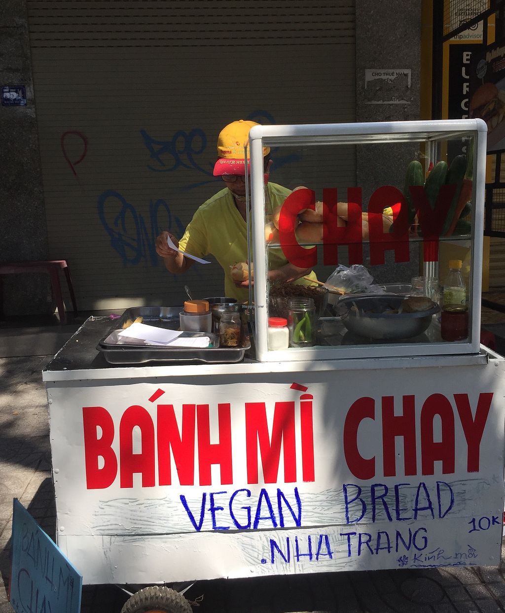 Food stall on the side of the road selling vegan banh mi sandwiches with seitan, marinated soy meat, fresh vegetables, and various sauces. Onion and shallot oil available as add-ons. Reported closed April 2024.