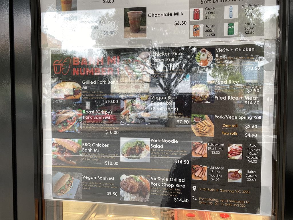 Serves meat, vegan options available. Restaurant offering vegan items like the "Vegan Banh Mi" with tofu, vege butter, cucumber, coriander, pickled carrot, and vegan sauce, and "Vegan Rice Paper Roll" with tofu, lettuce, rice noodles, and carrot. Open Mon-Sat 11:00am-5:00pm. Closed Sun.