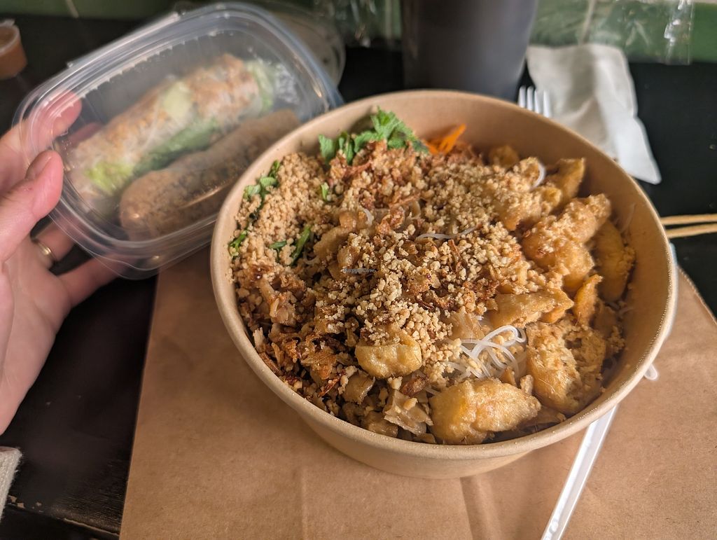 Serves meat, vegan options available. Vietnamese street food eatery with vegan options, including banh mi with tofu and seitan, salad, spring rolls, and noodle bowls. Reported closed August 2025.