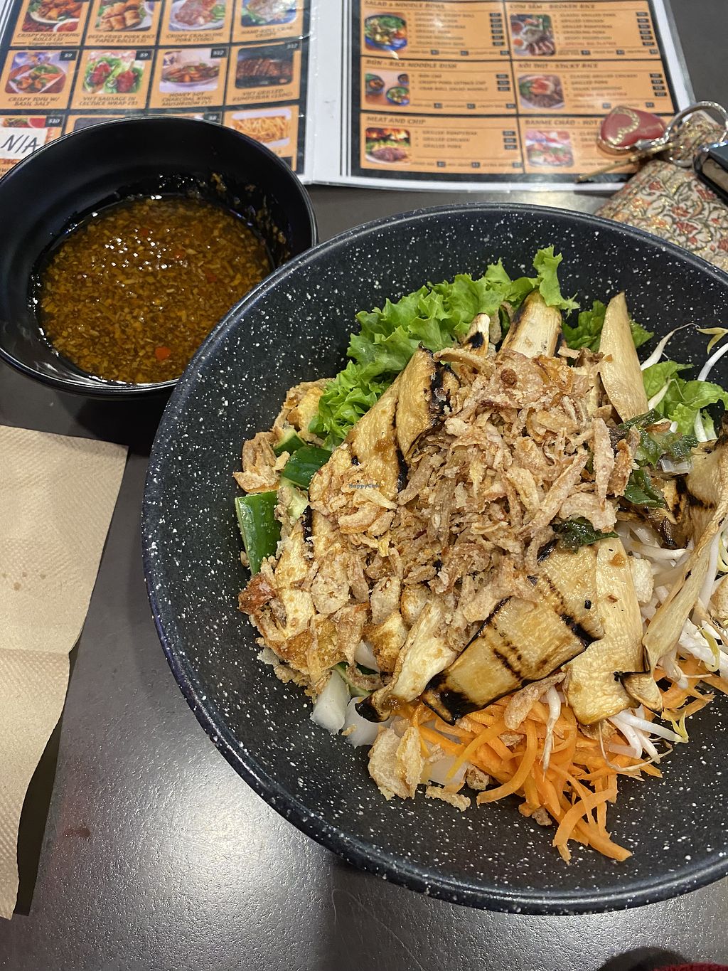Serves meat, vegan options available. Vietnamese restaurant serving vegan options, Tofu/ mushroom com tam (broken rice)