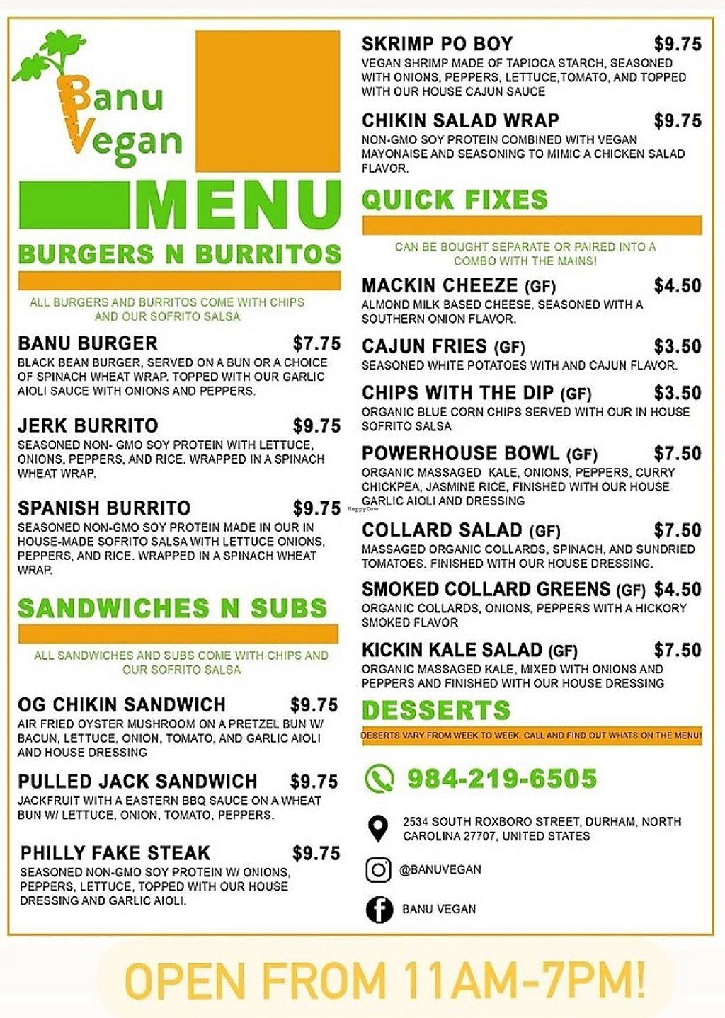 I visited Banu Vegan while visiting Duke for the day. I had the fried mushroom sandwich and Mac and cheeze. Both were delicious. I’d eat here again to try something different on the menu.