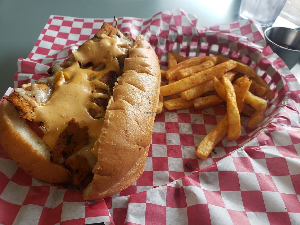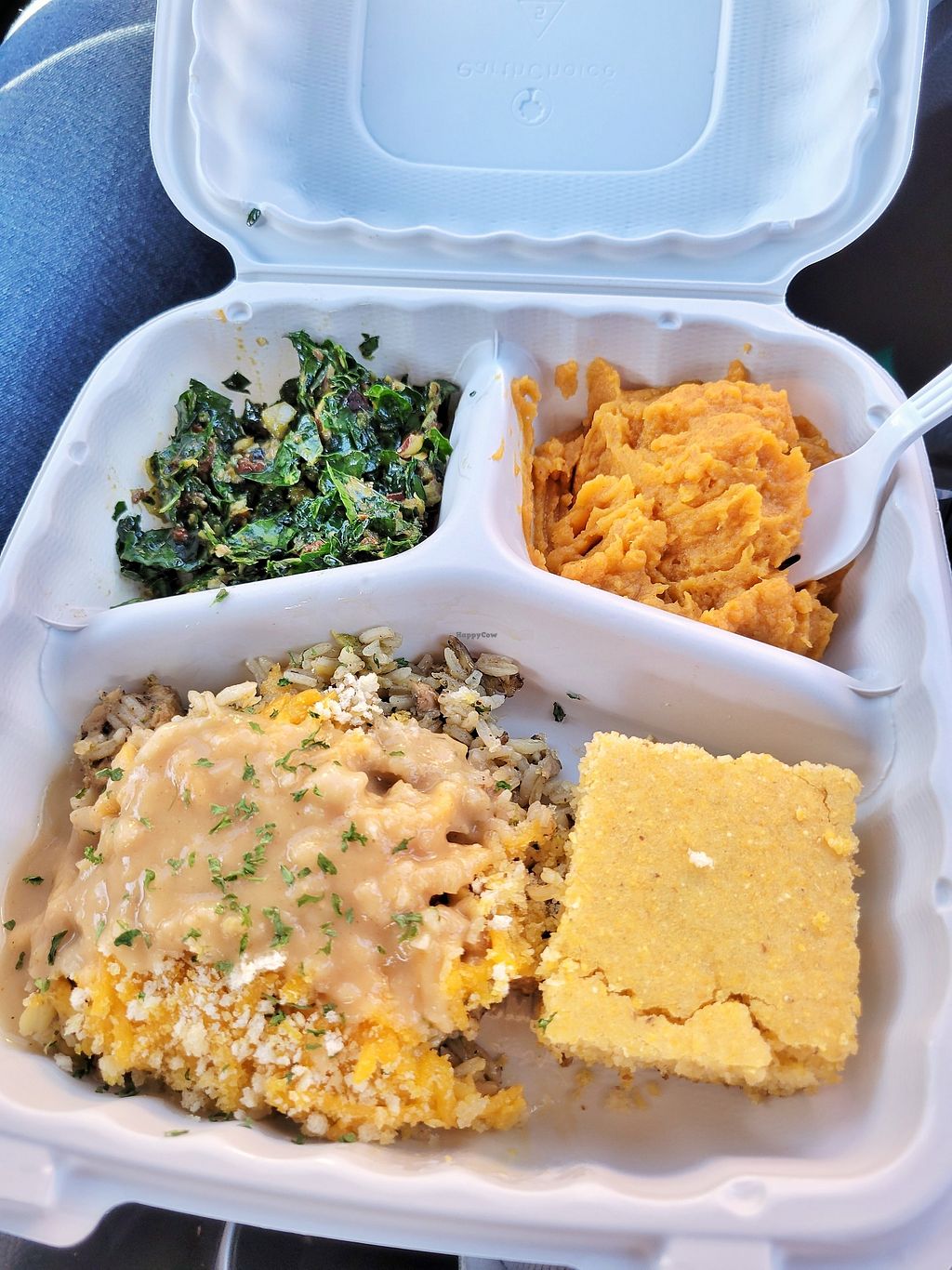 I had Phillie cheese steak with Mac and cheese. Hubby had BBQ jackfruit with chips. Both were really good, especially the nac and cheese. Deserts were amazing we had strawberry cake and sweet potato pie that reminded me of my late mother-in-laws. Yum! We'll be back!