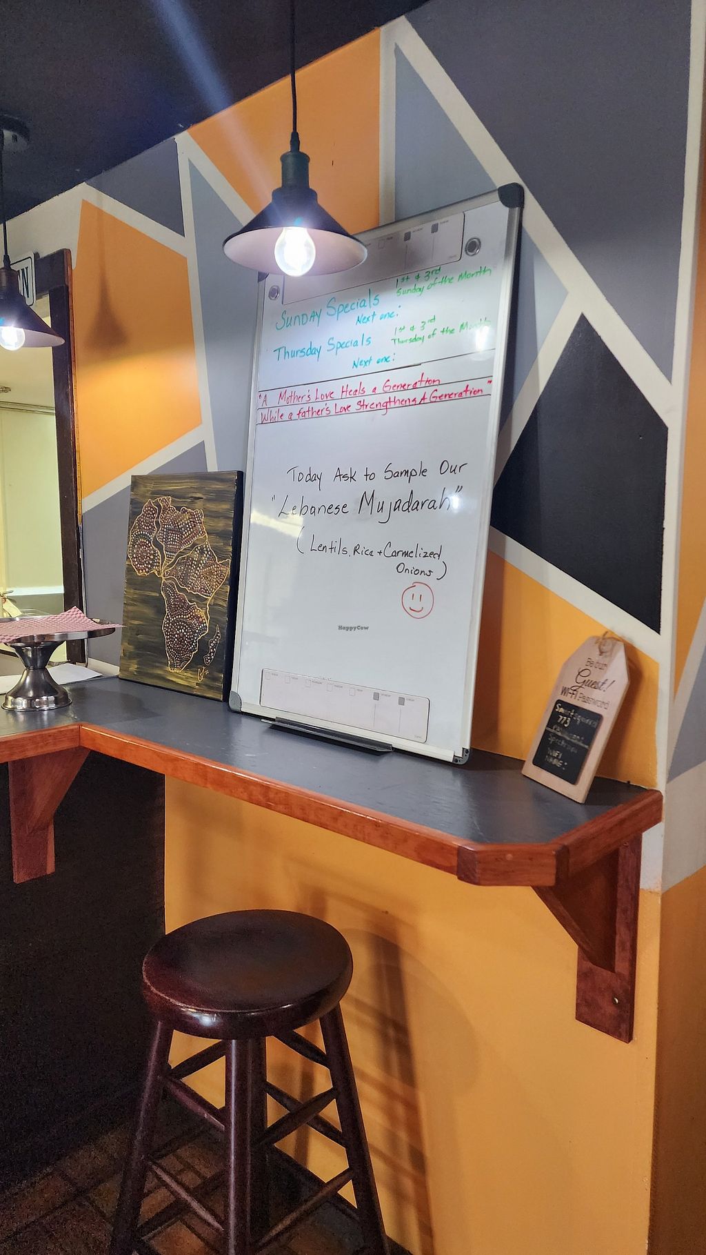 The ginger tea and strawberry lemonade were really good. Trued a sample of the Madrajhara (lentils, rice, and caramelized onions), it was really good. Collards were very smoky and good but a bit more oil than I'm used to. Mac and cheese was good, but a bit over. There were lots of stong flavors but wasn't salty, which was great. We also tried the sweet potato pie, which was awesome. We drove an hour and a half to try it out. We will definitely be back.