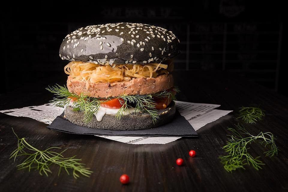 Vegan burger: black bombet, avocado, chickpea burger with parsley, you…