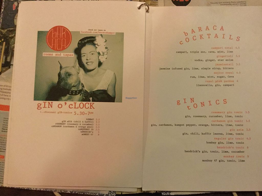 bARACA is a nice restaurant located in Street 726 and specialises in offering a range of international tapas ... I called in to have dinner tonight and chose the 3 vegan options from the menu ... the hummus and veggie sticks (US$2.00) was presented nicely and the hummus tasted great and the veggie sticks were fresh and crisp ... the Hummus Pintxo (US$2.00) tasted great and had a base of fresh crispy bread ... the Palak Tofu (US$3.50) is a spicy Indian style curry with a side disk of rice... many of the other menu items are vegetarian and can be veganised if requested by customers ... bARACA has very friendly English speaking staff that provide helpful and attentive service ... there is free wifi
