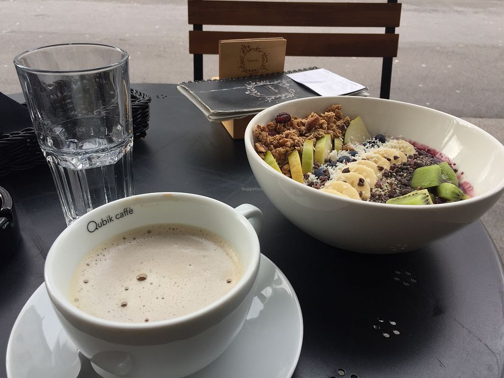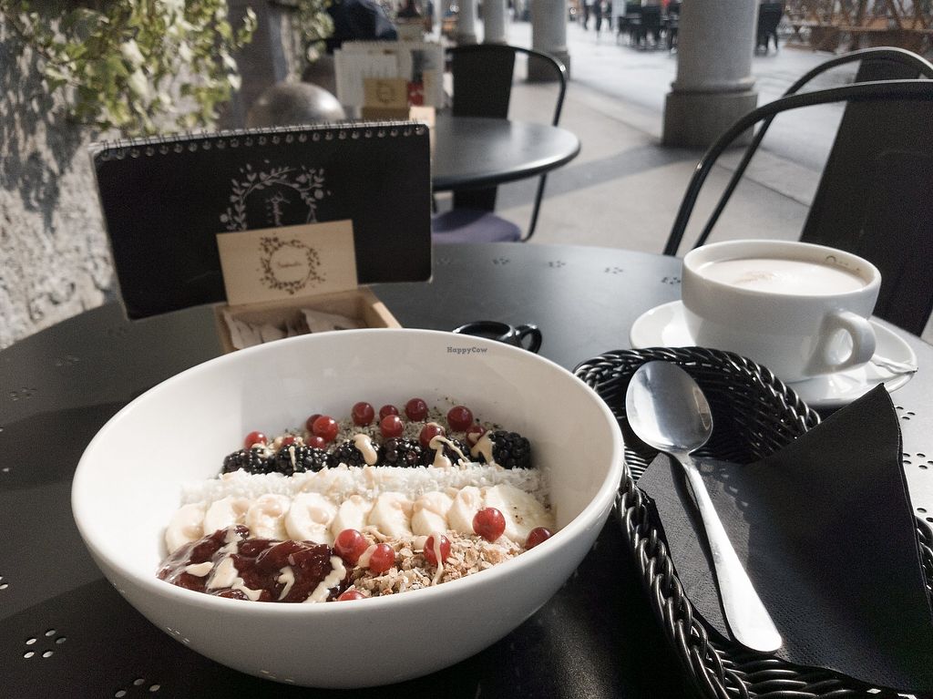 Caffé Latte with oat milk and Smoothie Acai Bowl
