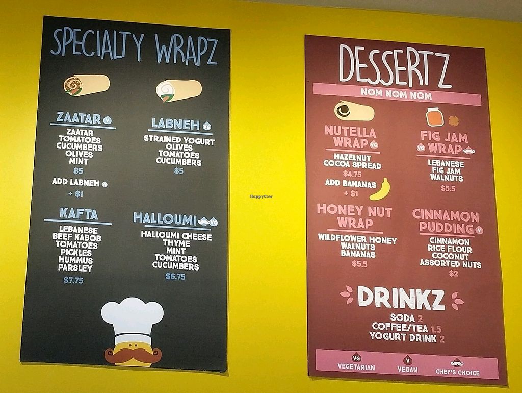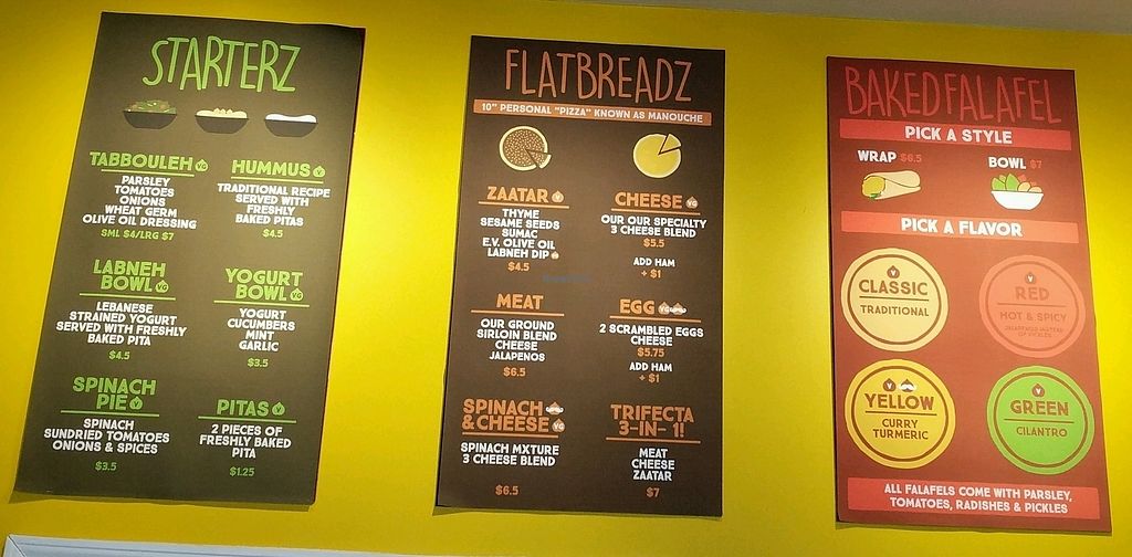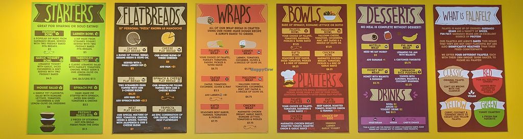 Serves meat, vegan options available. Lebanese food, includes baked falafel wraps and salads, flatbread. The falafel dishes and zaatar wrap are vegan. Flatbread can be when leave off the labneh. Vegan labeled on the menu. Open Mon-Sun 11:00am-8:00pm.
