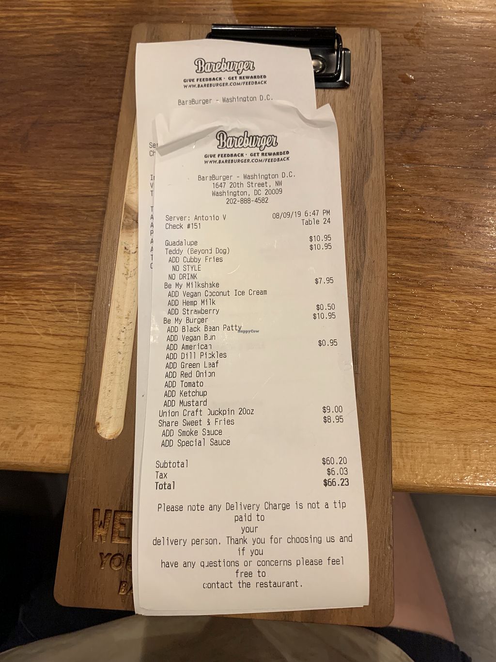 Probably the easiest and best vegan meal we’ve had in DC, thus far. Antonio, our waiter was awesome and explained that the entire back of the menu is all Vegan options, including the kids meal. Very impressive. Was definitely pricey (coming in at $82, with tip) for three meals, fries and a beer.