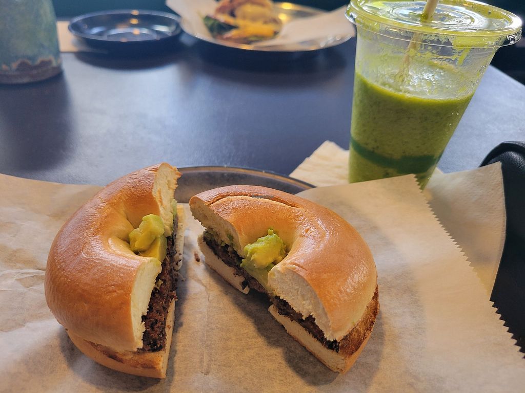 We got smoothies, lattes, a coconut cake, and a bagel with cashew cream cheese. Everything was delicious and they have a bathroom. Parking is in the back.