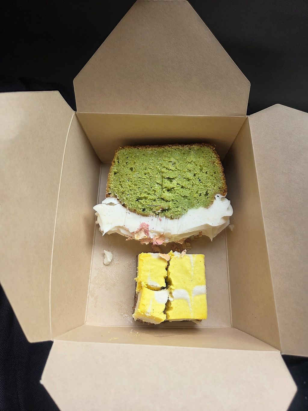 Wir haben Kuchen mitgenommen, der war ok. Das Frosting sehr lecker. Das eine Stück wirklich sehr klein.