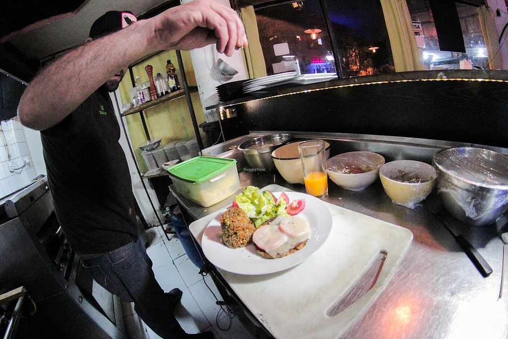 Bife de Seitan napolitano vegano con arrocito y ensalada