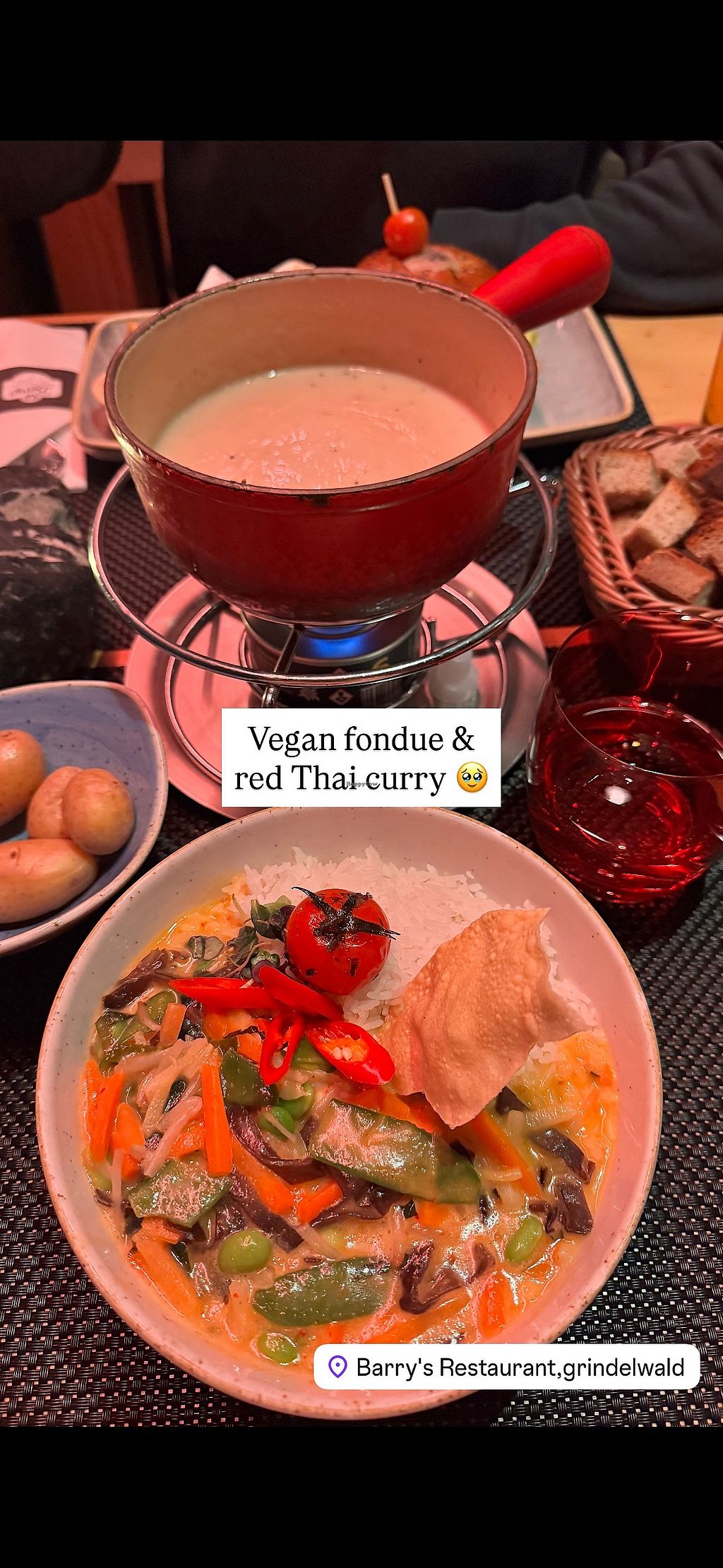 They have quite a bit of vegan options. I got the vegan “no cheese” fondue (cashew based) & red Thai curry. The fondue was SO GOOD and came with bread and potatoes. I do wish it came with some pickled veggies like some other fondue spots serve. We also tried the vegan fondue at Lulu in Zurich but this was leagues better. The red curry was pretty good and very comforting.