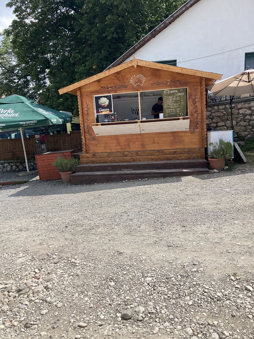 Langos hut in the town centre offering vegan options. The dough is vegan, and a vegan langos can be made with cherry or blueberry jam. Note: The service may not understand the term 'vegan', so specify 'de post'. More