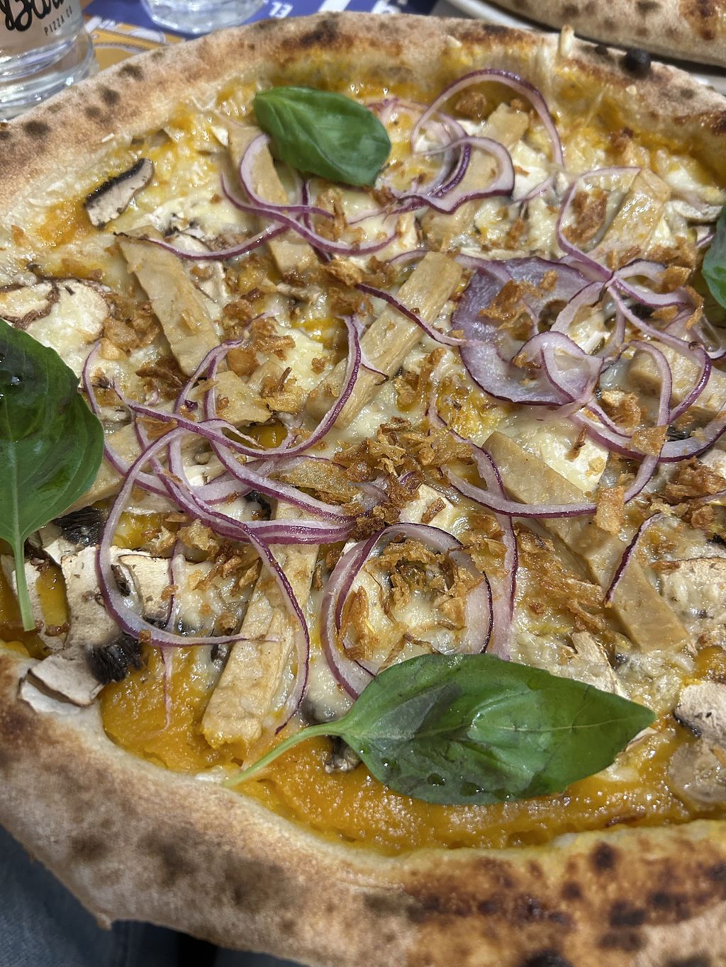 Fully vegan pizza with roasted vegetables add vegan cheese. DELICIOUS!…