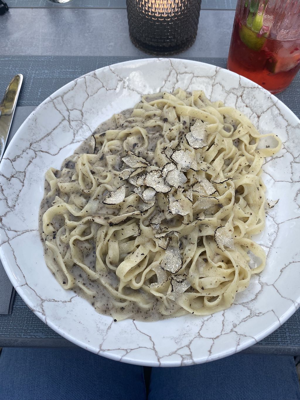 Read moreIch hatte die Nudeln mit Trüffel-Sahne-Sauce, welche erstklassig waren! Es gab leider keinen veganen Parmesan, normalerweise hätten sie den wohl da. Die Gnocchis gab es nicht, stattdessen wurden vegane Ravioli mit grünem Spargel, Tomaten und laut Aussage der Kellnerin - Bärlauchpesto - welches aber nicht herausgeschmeckt wurde.