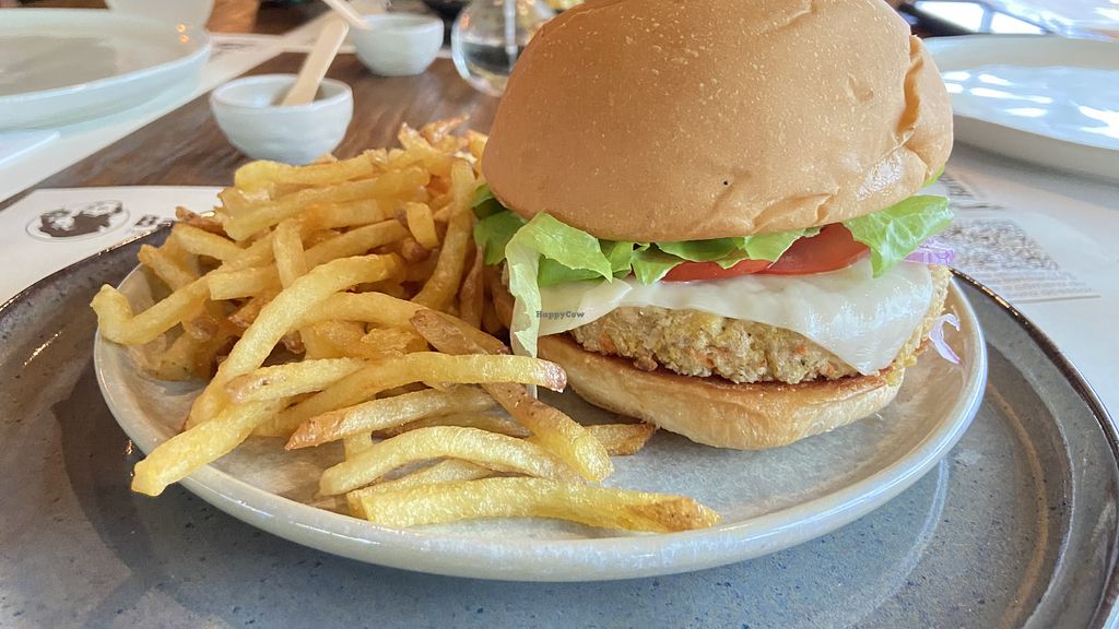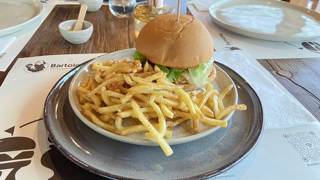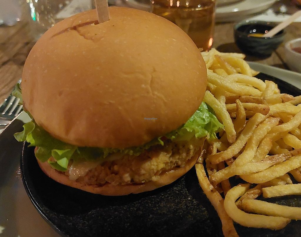 Hambúrguer vegano com hambúrguer de Lentilha defumada e batata de acom…