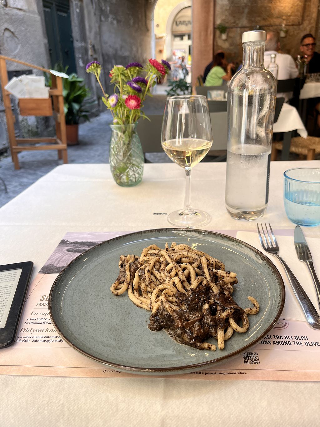 I have spent 2 great hours in this restaurant at the center of lovely Orvieto. The few vegan options they have are simply delicious. We started with a selection of bruschetta and followed with an incredible local pasta (Umbricelli) with black truffle. Rita, the owner, has been super gentle and helpful in making sure we were having a good time. They also offered us an oil tasting with bread as complementary to our starter. They have few table outside where it is really enjoyable to eat. Price is more than fair. Great stuff
