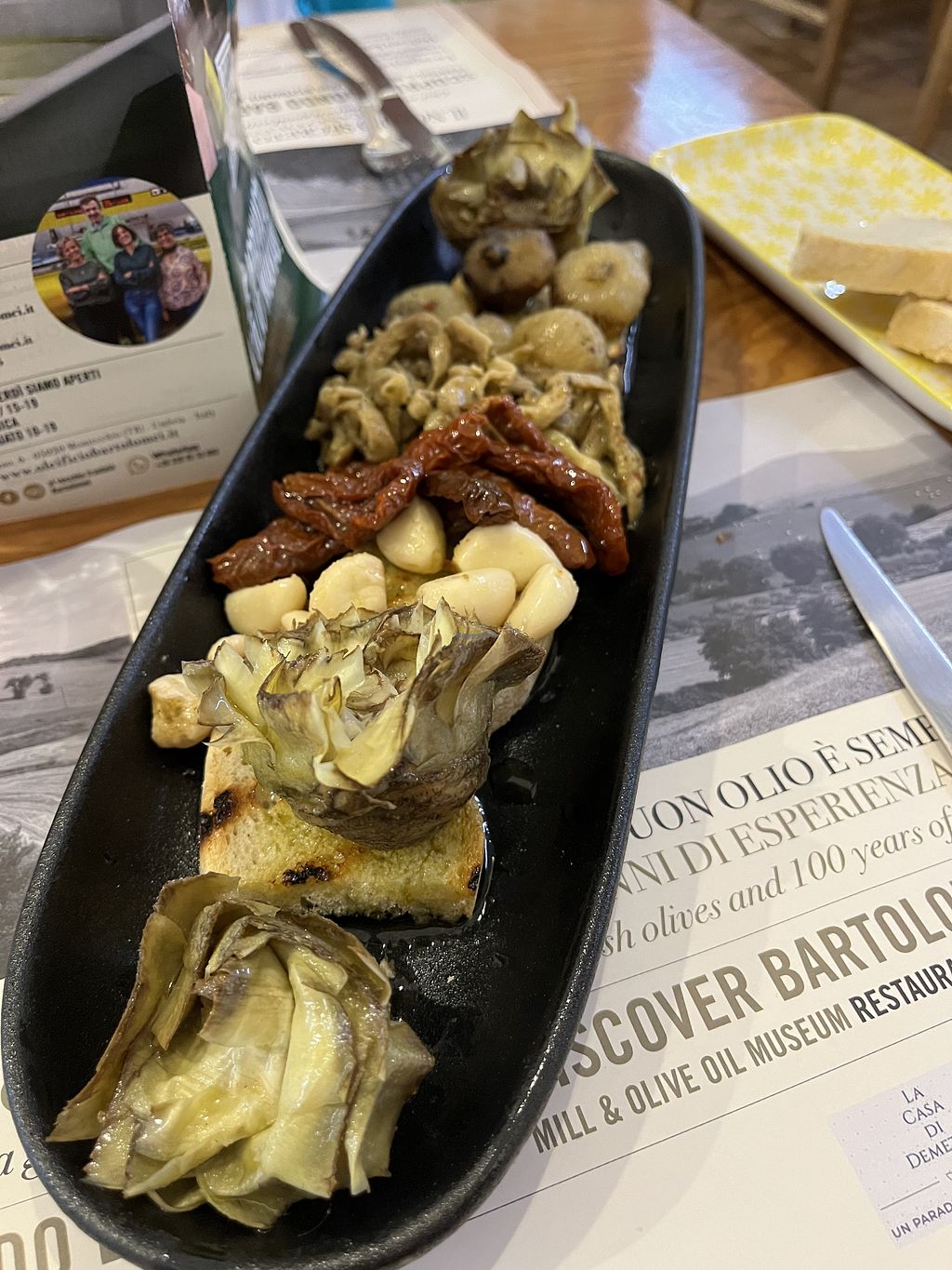 Read moreWe shared mixed bruschetta, a platter of artichokes, mixed, peppers, onions, bread and garlic, and a bowl of cannellini bean mousse. Delicious, and very filling. The olive oil is produced by the owners.